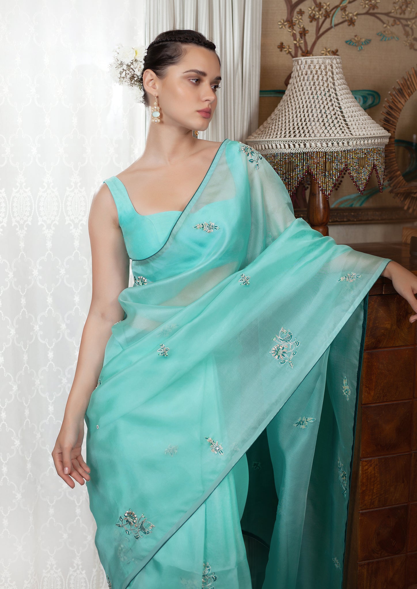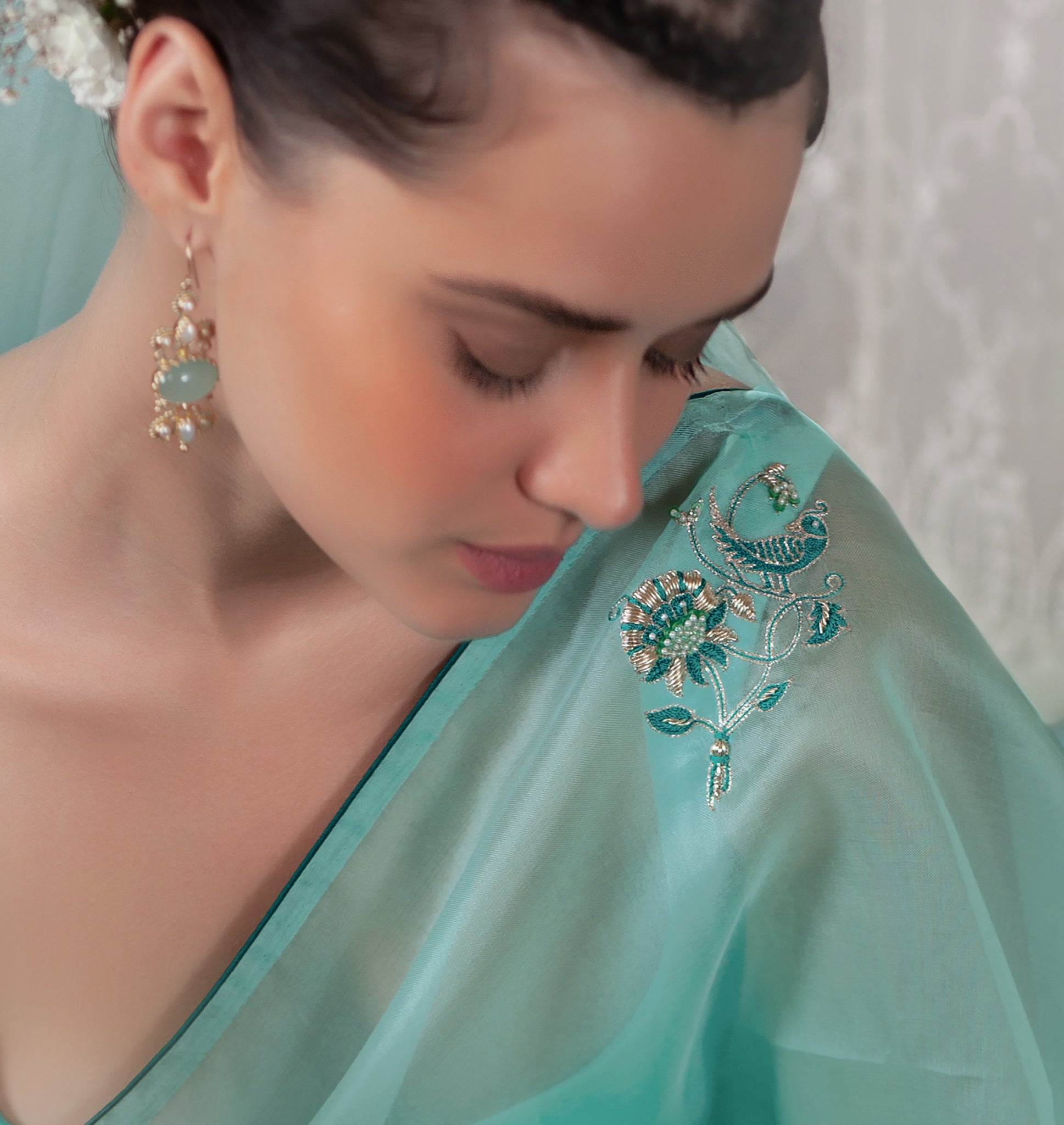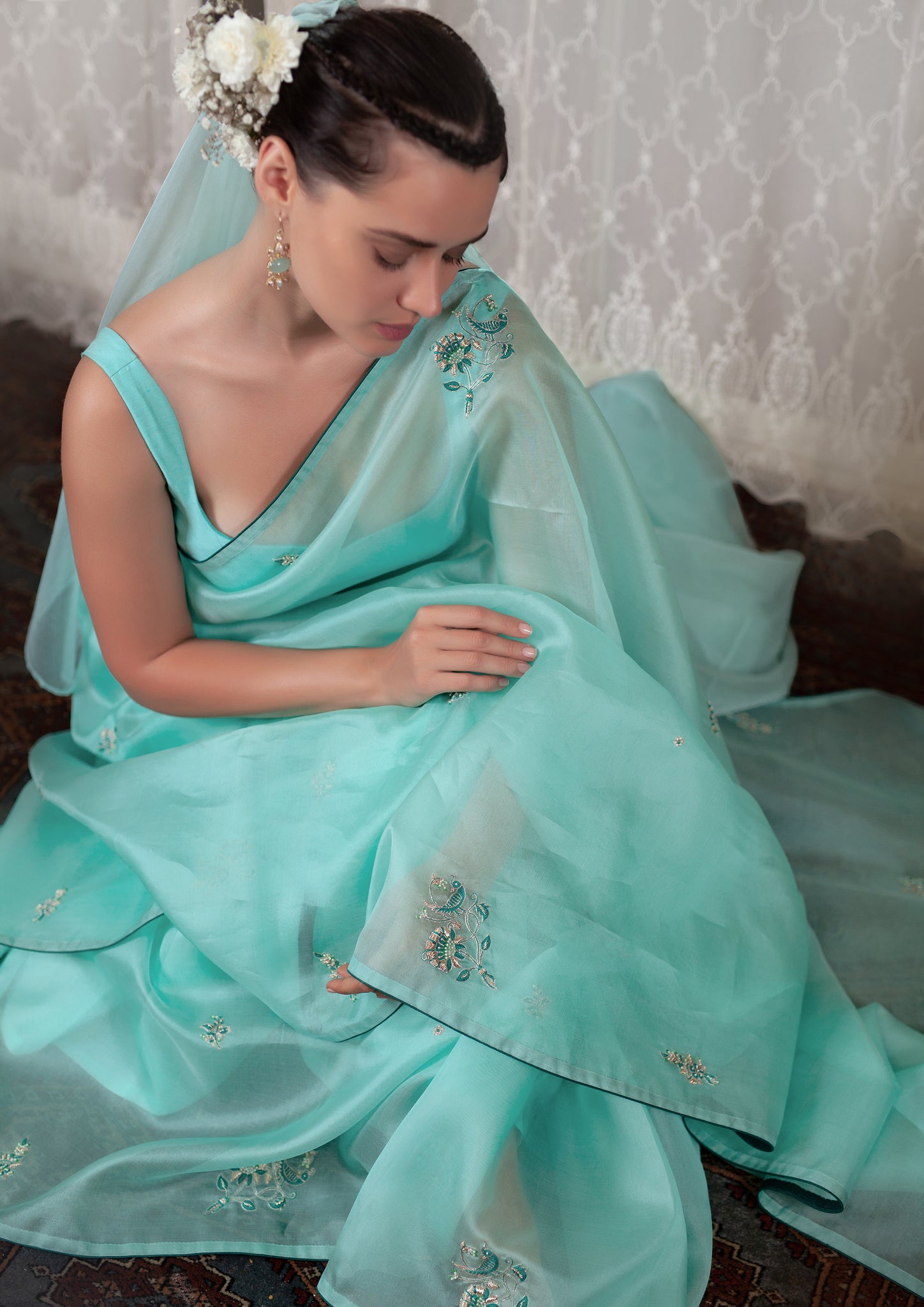 The softest silk organza sari in celeste blue feels dreamy and romantic. The beauty of the textile is further enhanced with our signature hand embroidery, incorporating zardozi, aari and delicate pearls.