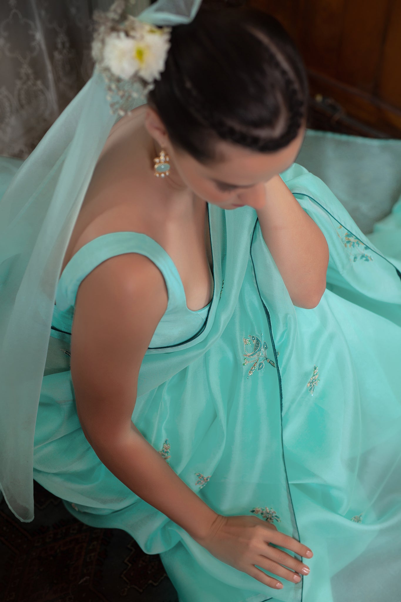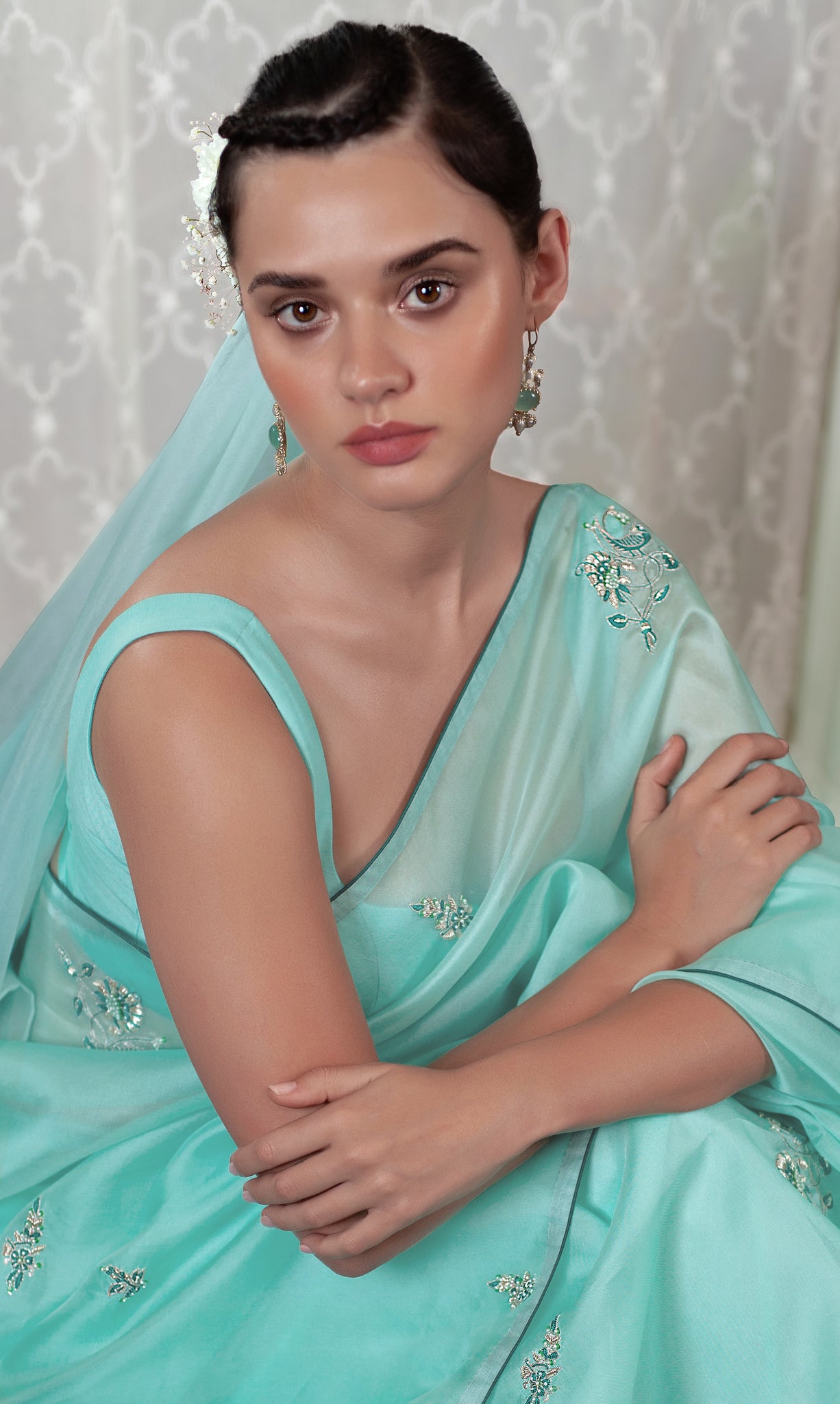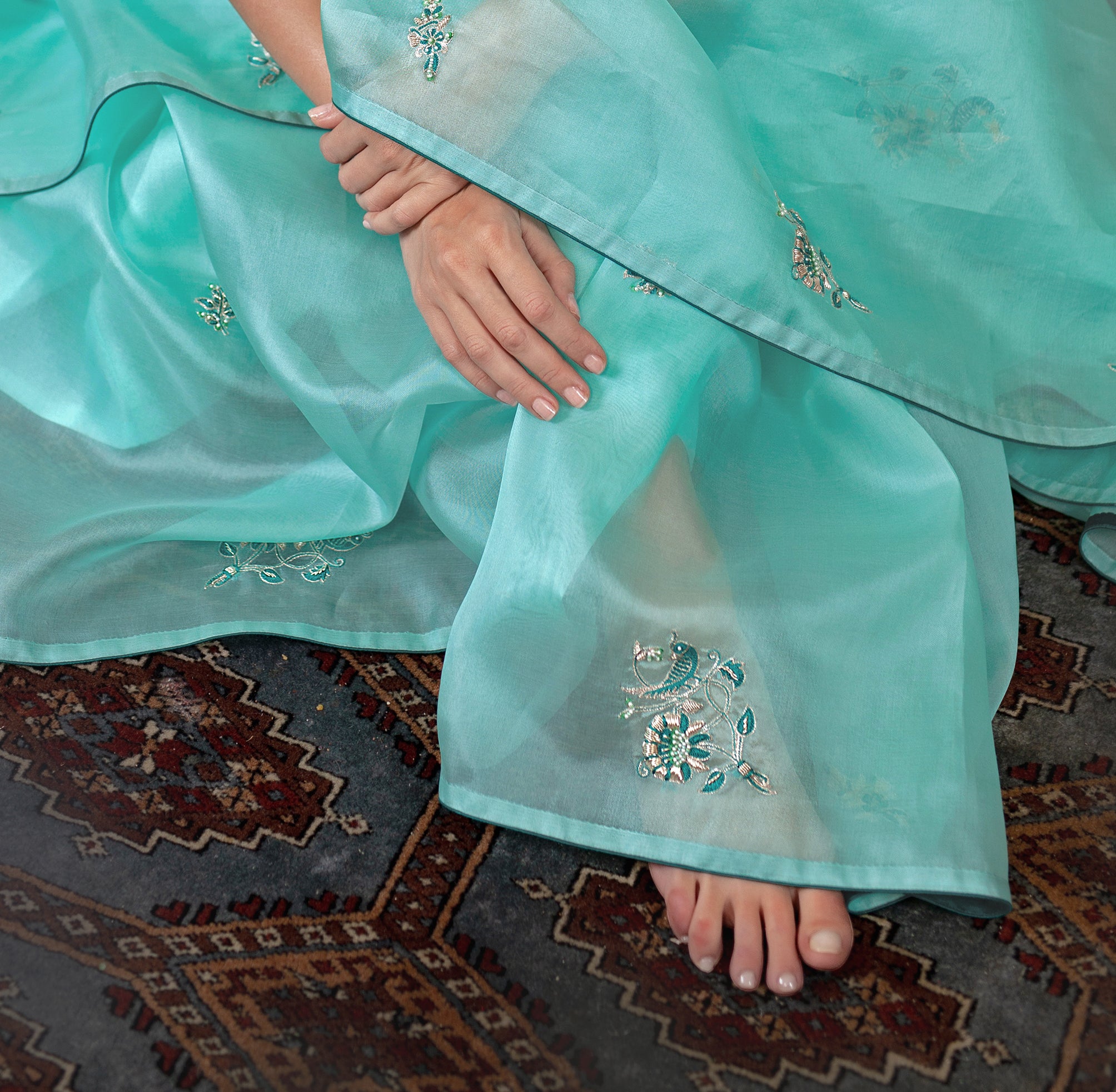 The softest silk organza sari in celeste blue feels dreamy and romantic. The beauty of the textile is further enhanced with our signature hand embroidery, incorporating zardozi, aari and delicate pearls.