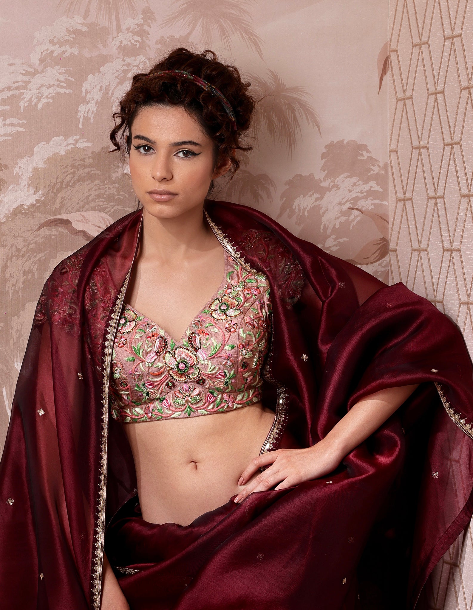 · A Botanical Tribute: Features artfully embossed floral motifs inspired by gardens, meticulously hand-embroidered using Zardozi, silk thread, beads, glass beads, and sequins.