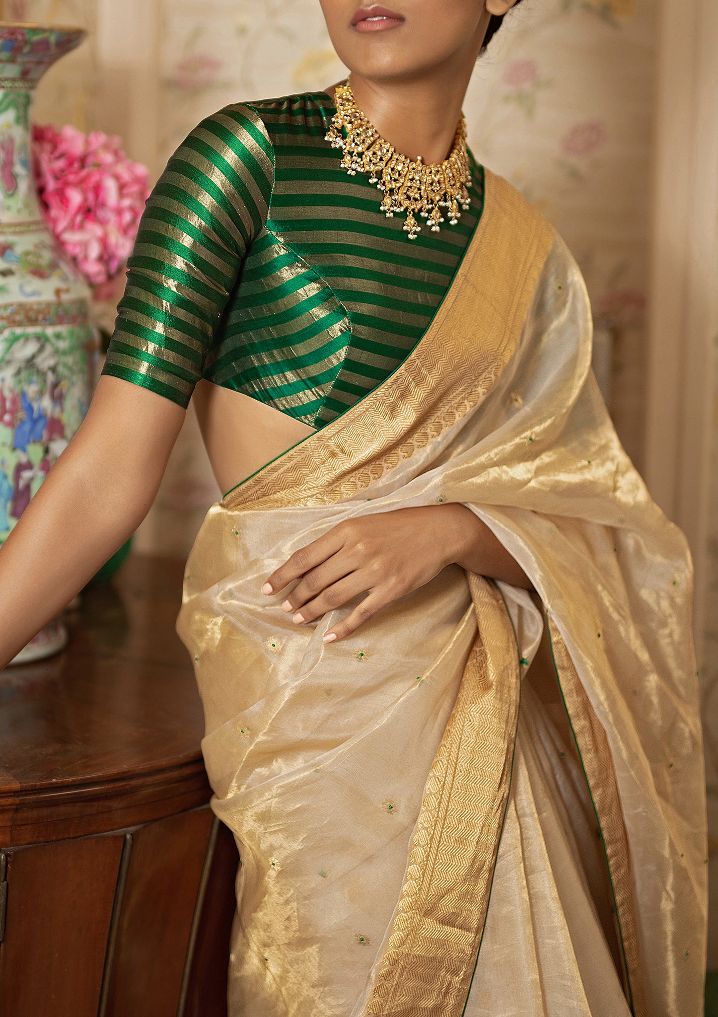 Features: Green and light gold striped blouse