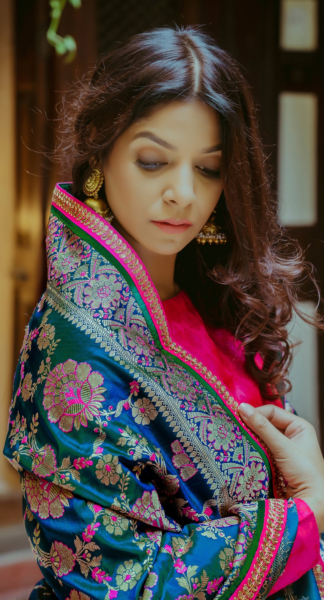 The Banarasi dupatta in two-toned peacock blue is handwoven from pure silk yarns in an intricate floral pattern, along with our signature minakari embroidery. Wear it over a tanchoi straight kurta and pants.
