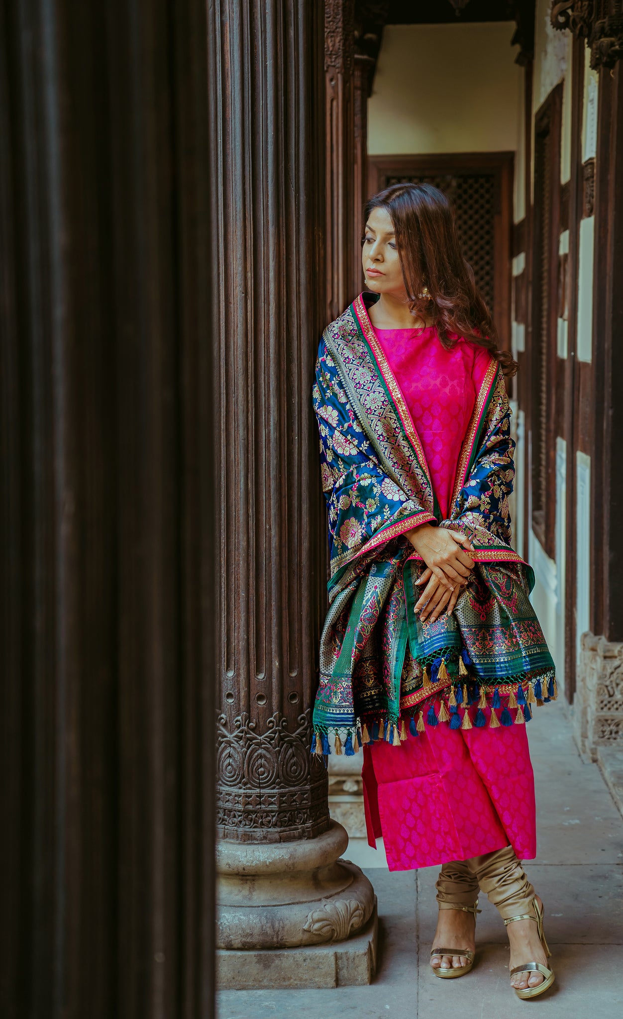 Dupatta  The Banarasi dupatta in two-toned peacock blue is handwoven from pure silk yarns in an intricate floral pattern, along with our signature minakari embroidery. Wear it over a tanchoi straight kurta and pants.  Handloom Light gold floral all-over pattern is highlighted with fuchsia hand embroidery...Read more