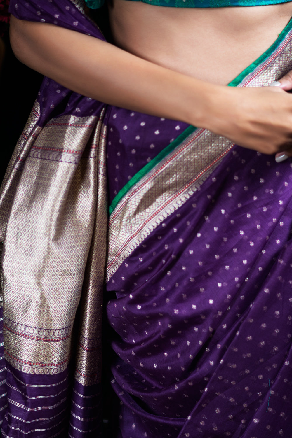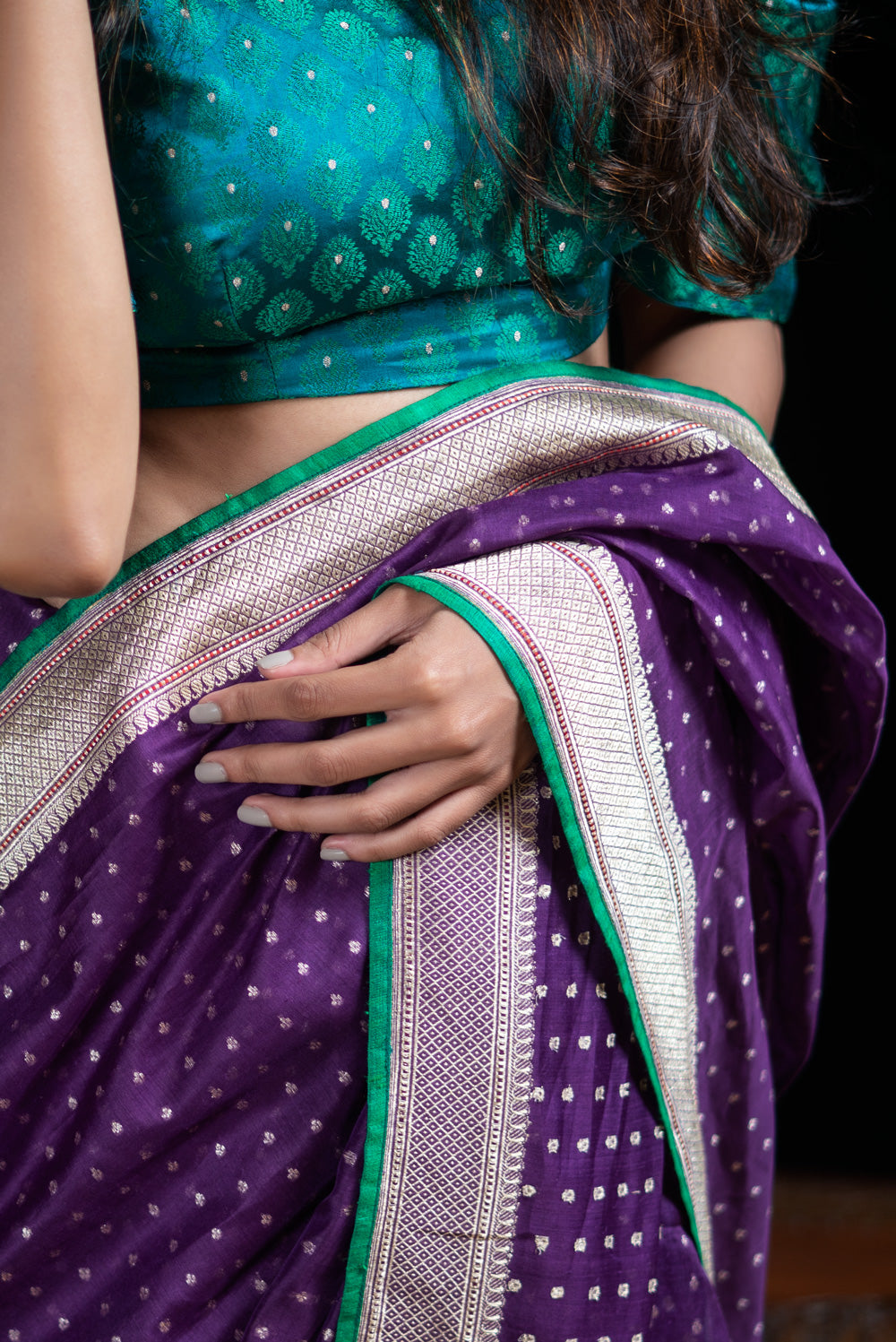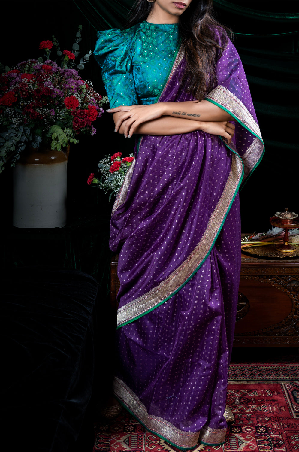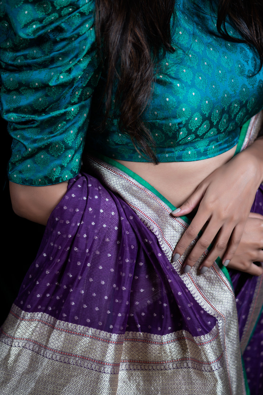 - The sari comes with a plain sea-green silk unstitched blouse piece.