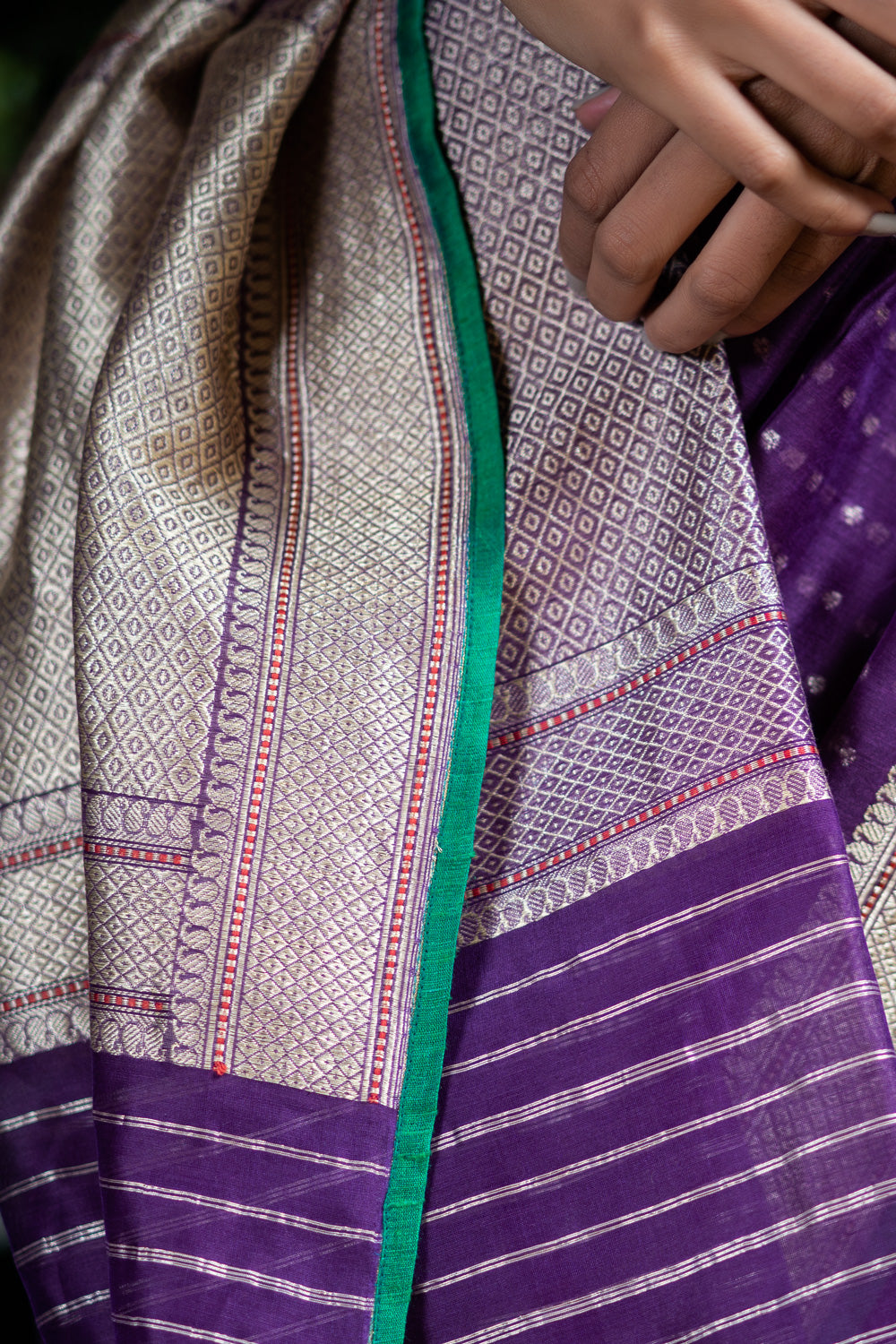 Crafted in silk cotton, the handloom Sari is made interesting with a contrasting green raw-silk border.