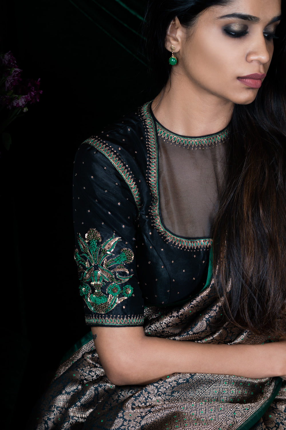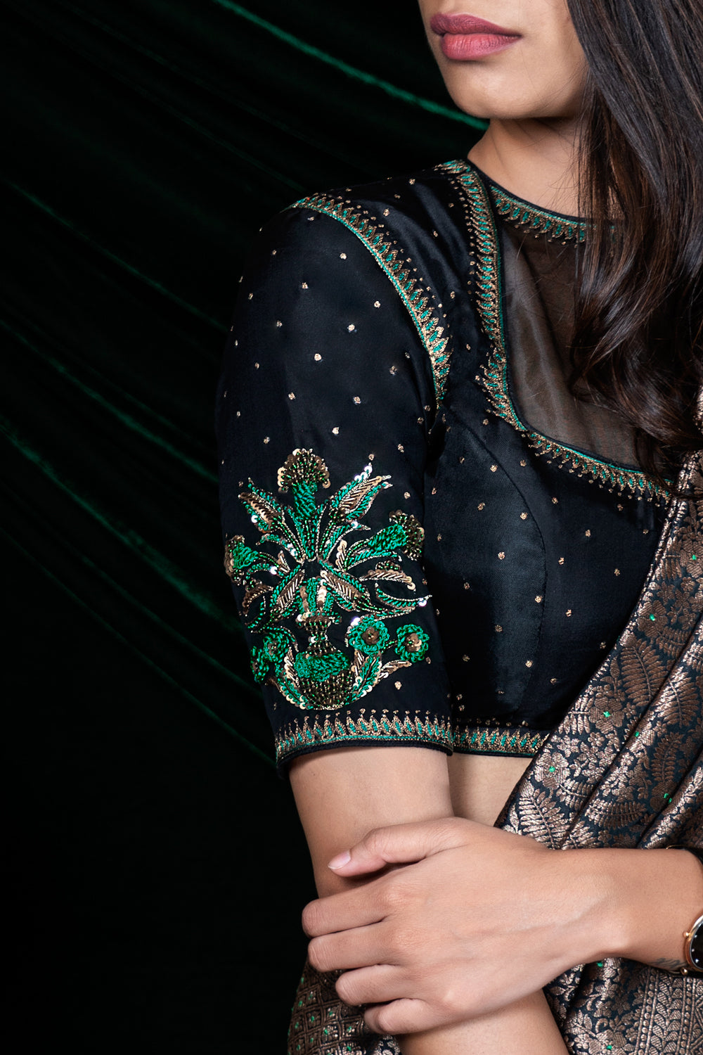 Designed to be worn with our Dancing Leaves sari or classic handwoven saris, the elegant silk blouse in black is fully embroidered with tiny zari dots and a tulip flower vase motif on the sleeves, inspired by the art of Iznik.