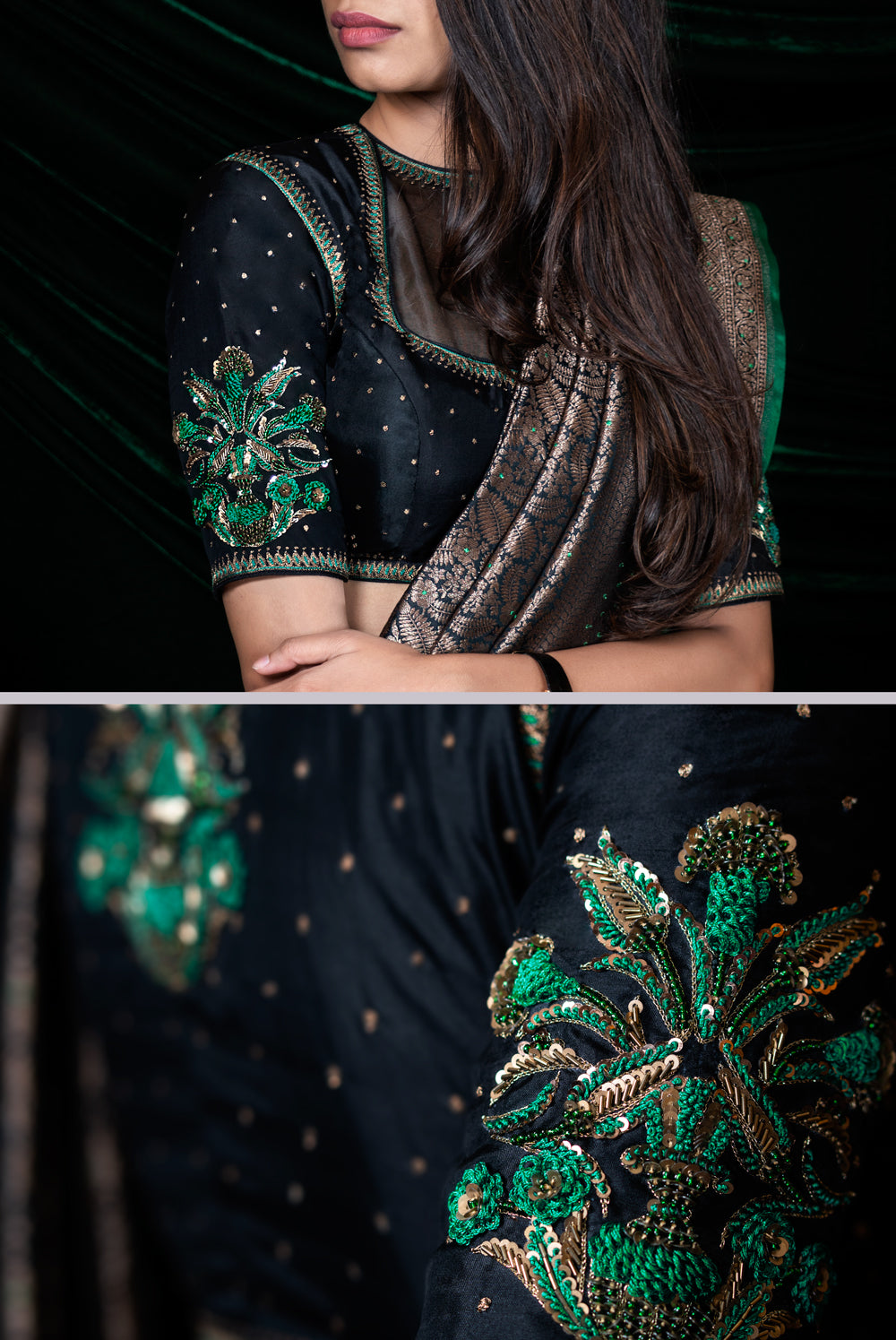- Light gold aari, French knots, and sequins embroidery highlighted with green silk thread