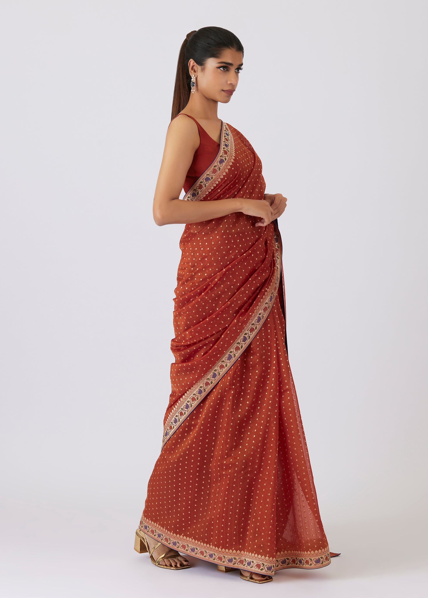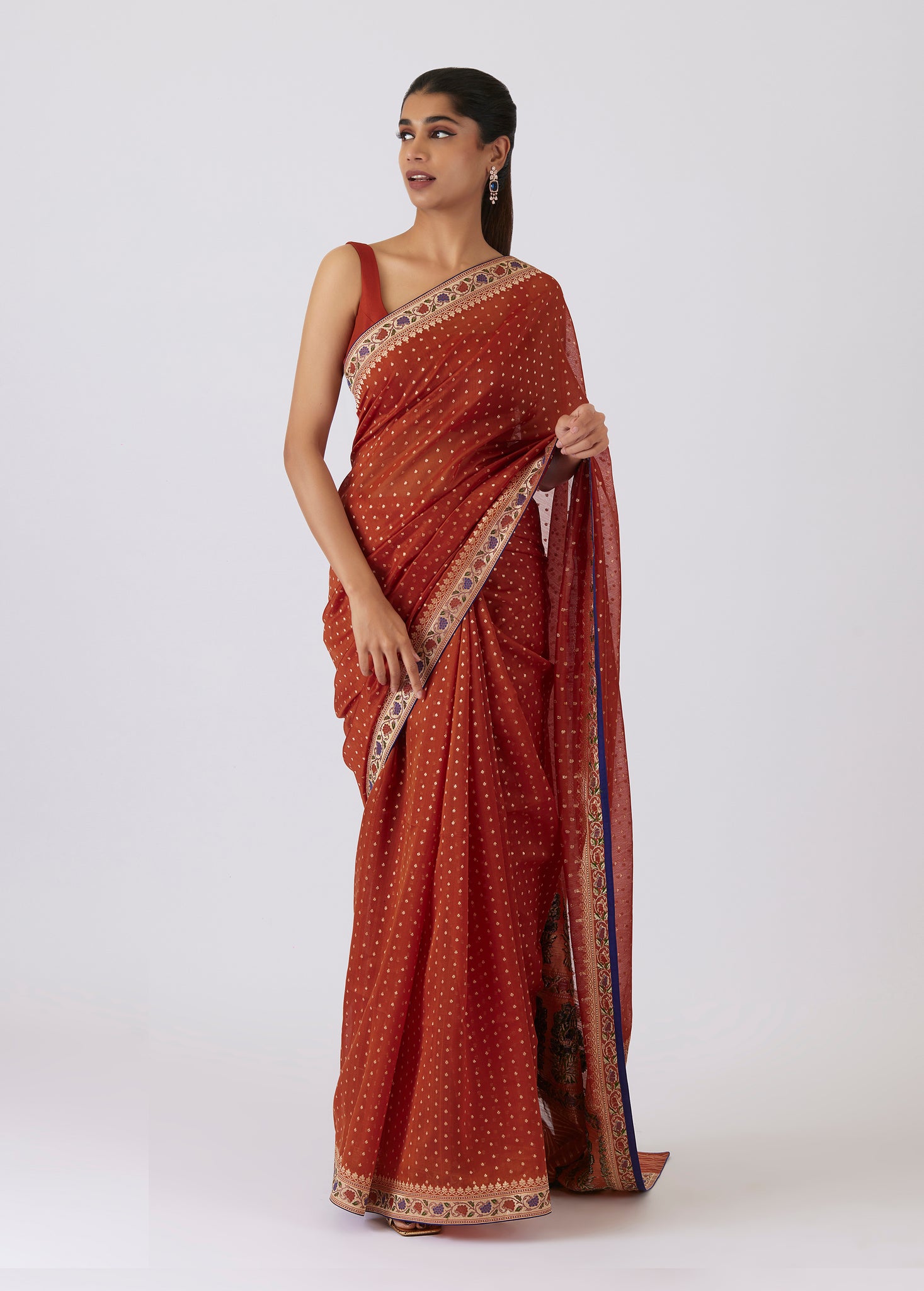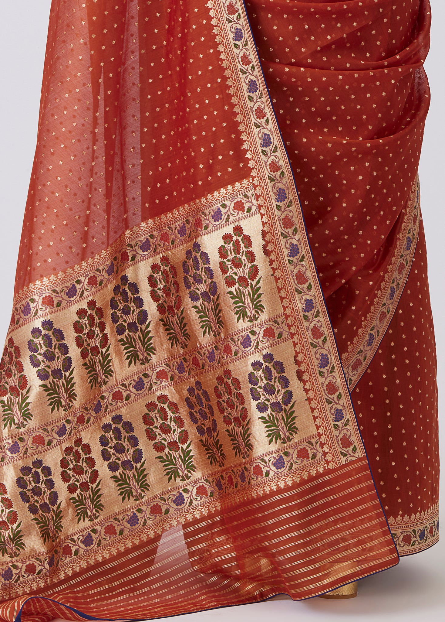 Experience the luxury of a handwoven Banarasi sari in a lovely shade of rust.