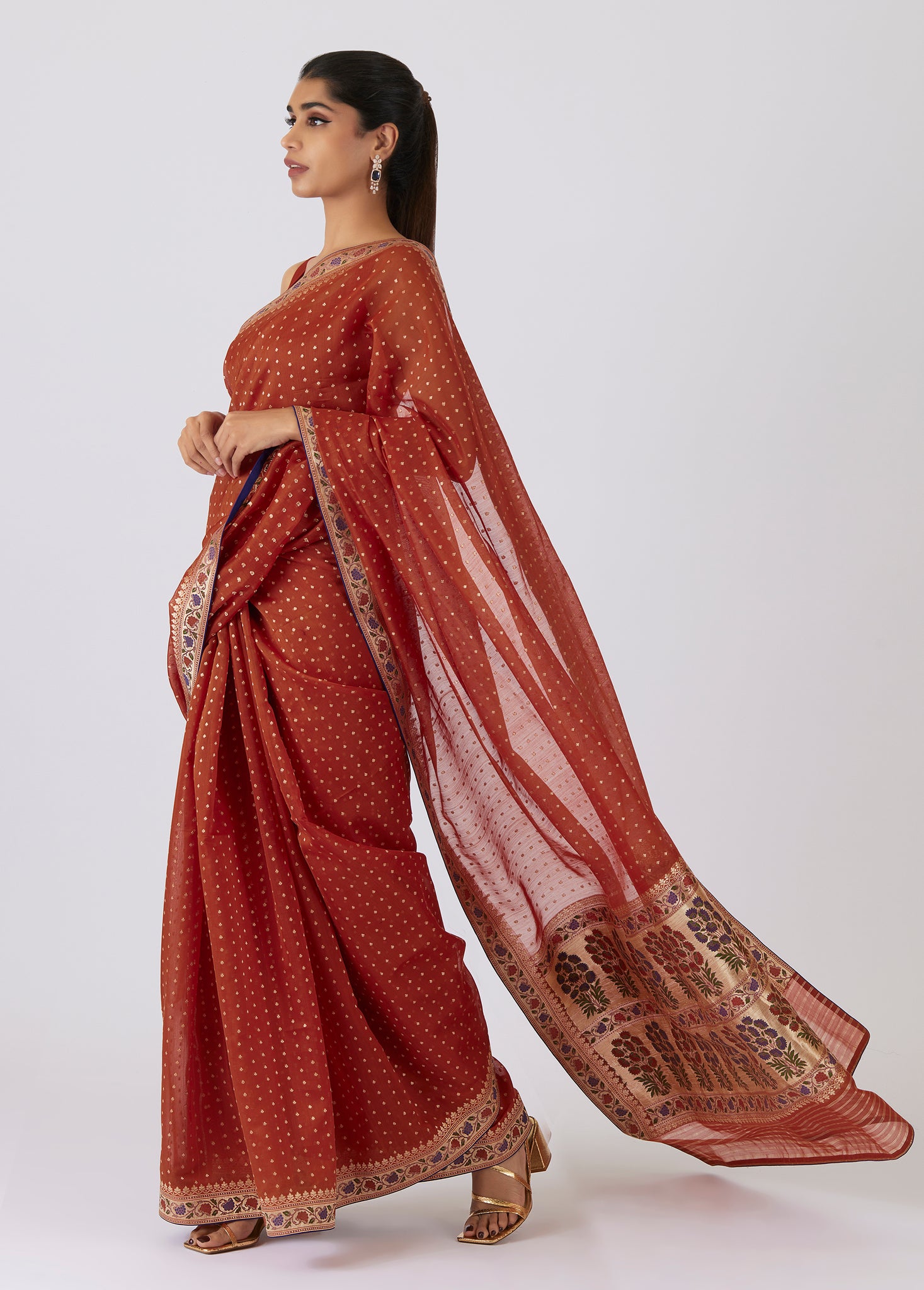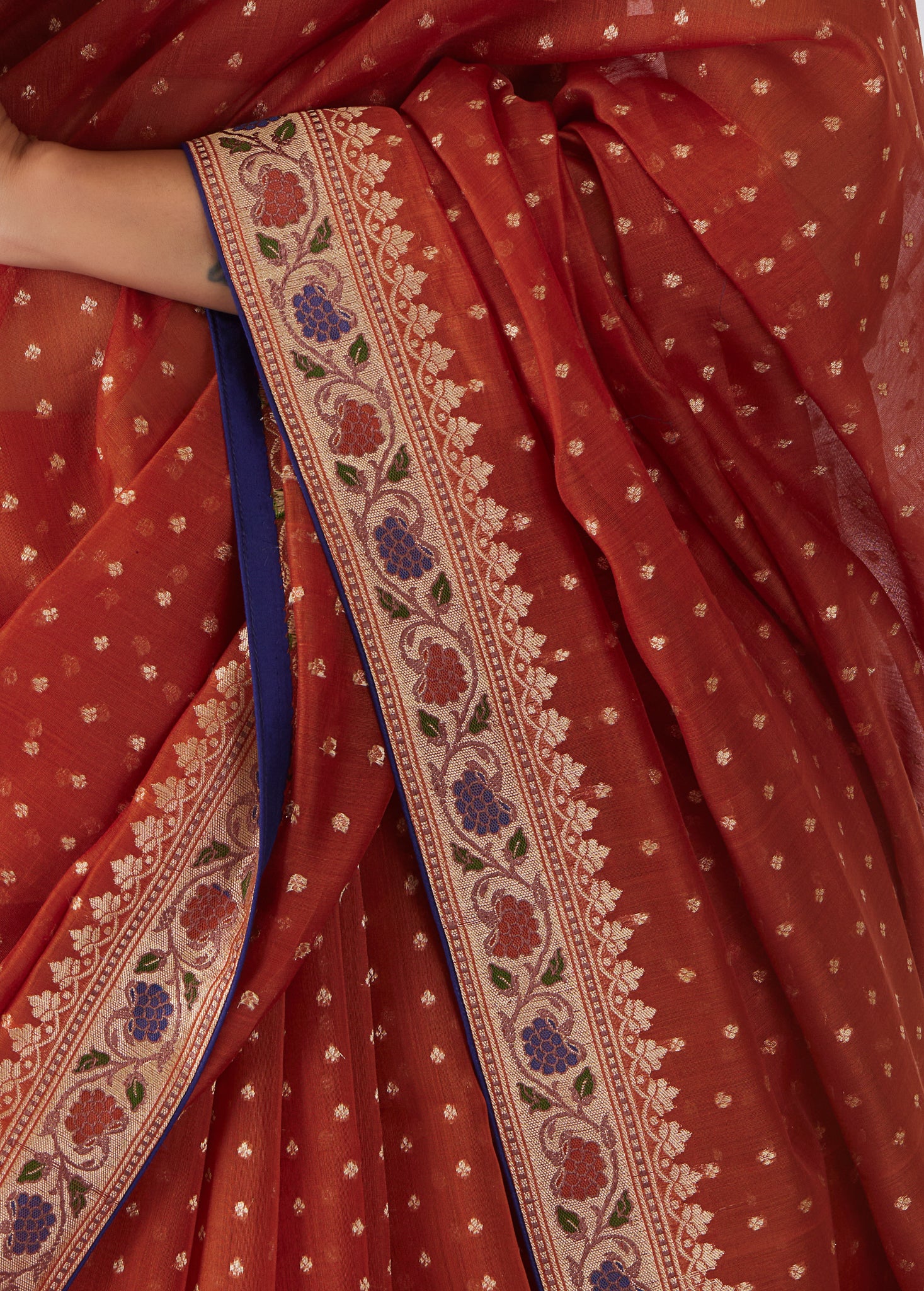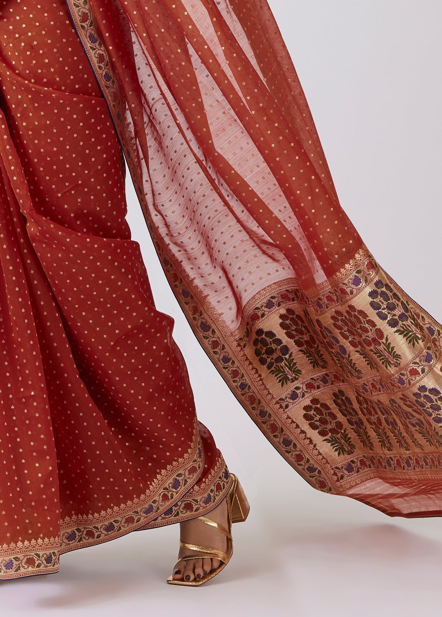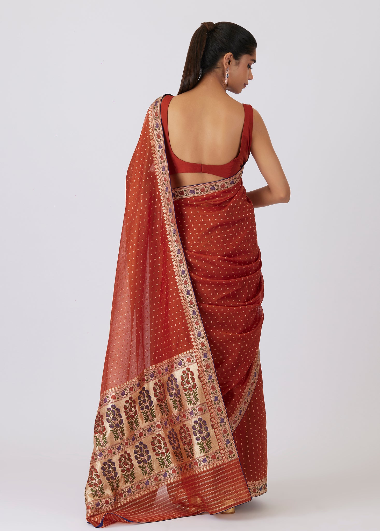Experience the luxury of a handwoven Banarasi sari in a lovely shade of rust.