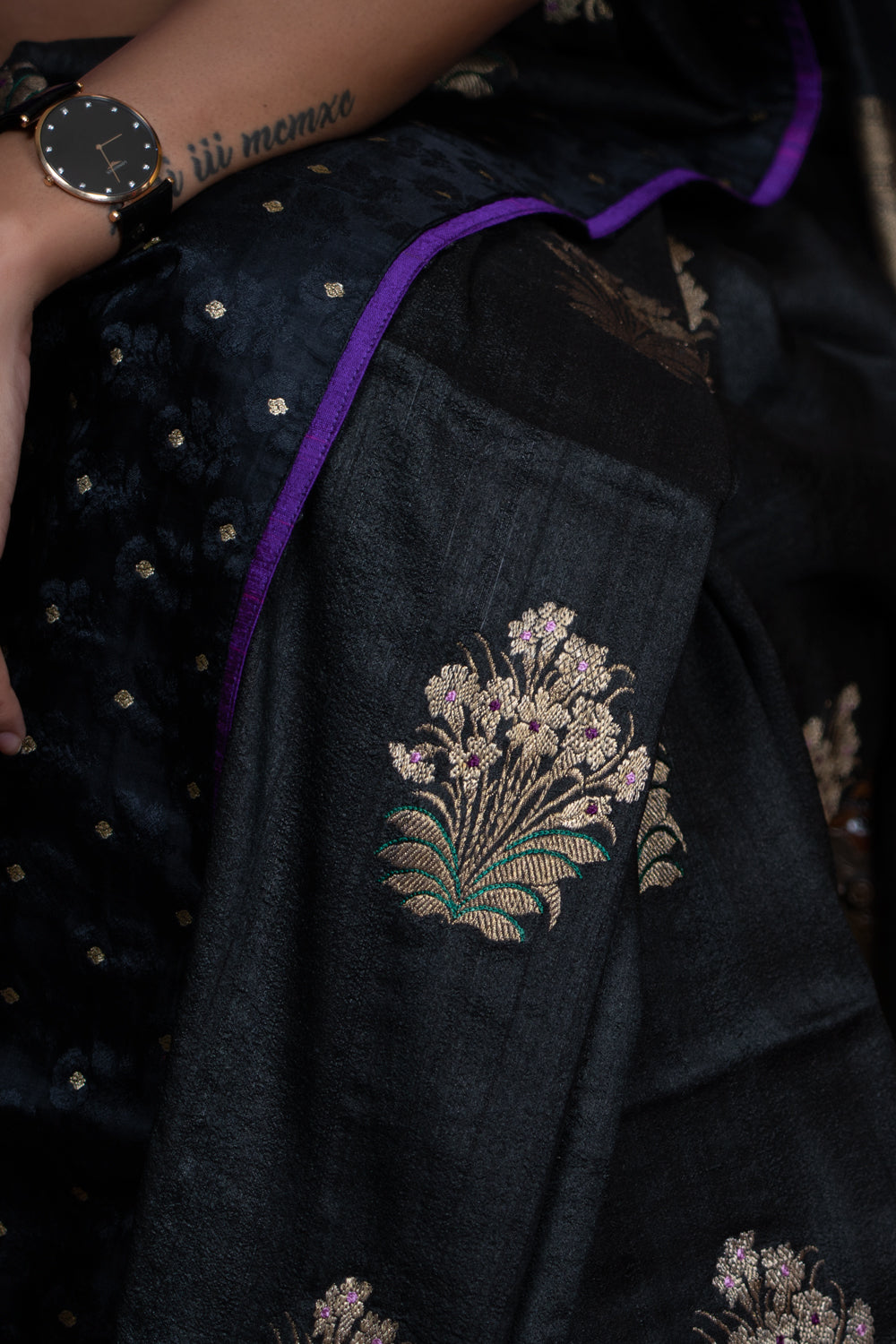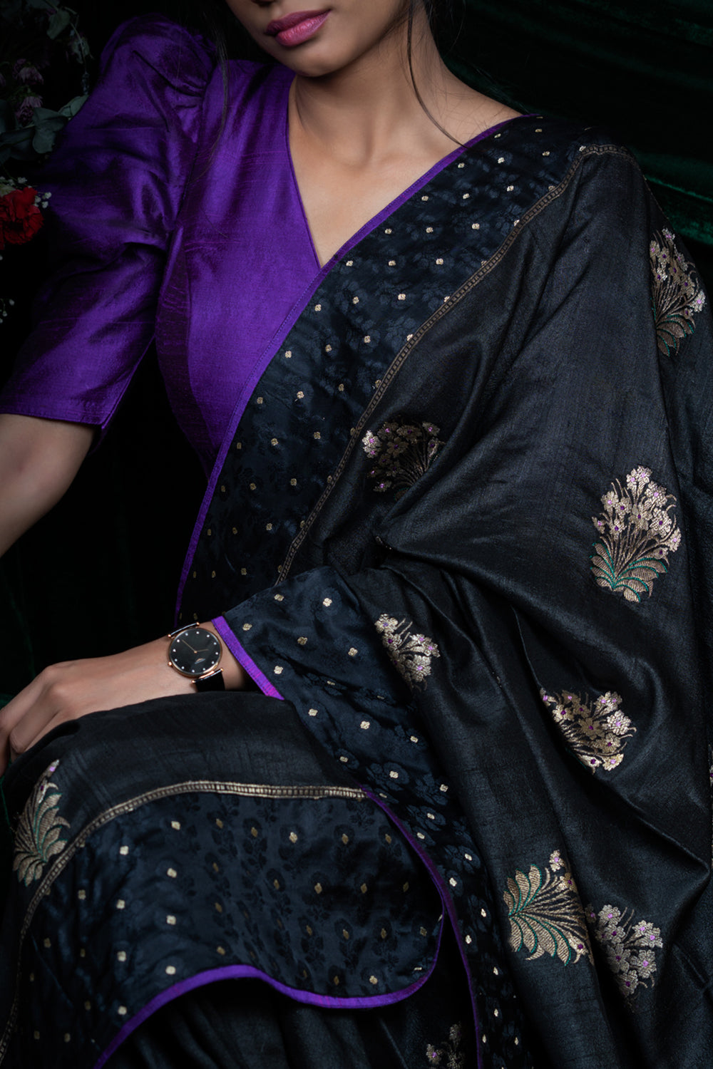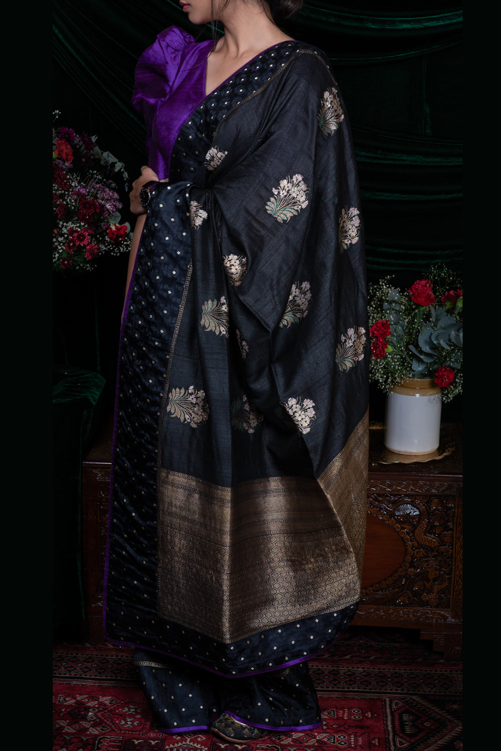 The Banarasi tussar-silk sari has stylized Mughal floral motifs and is enhanced with a zari-dotted tanchoi silk border. Purple raw silk trim on the edges further adds an element of surprise.
