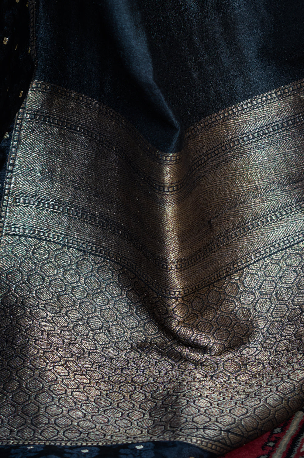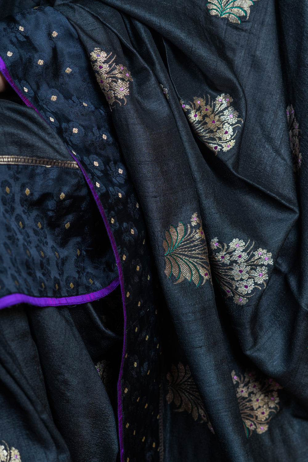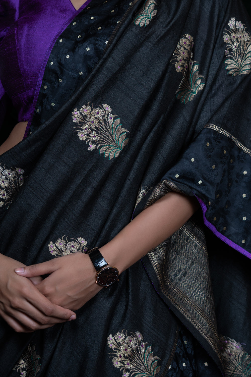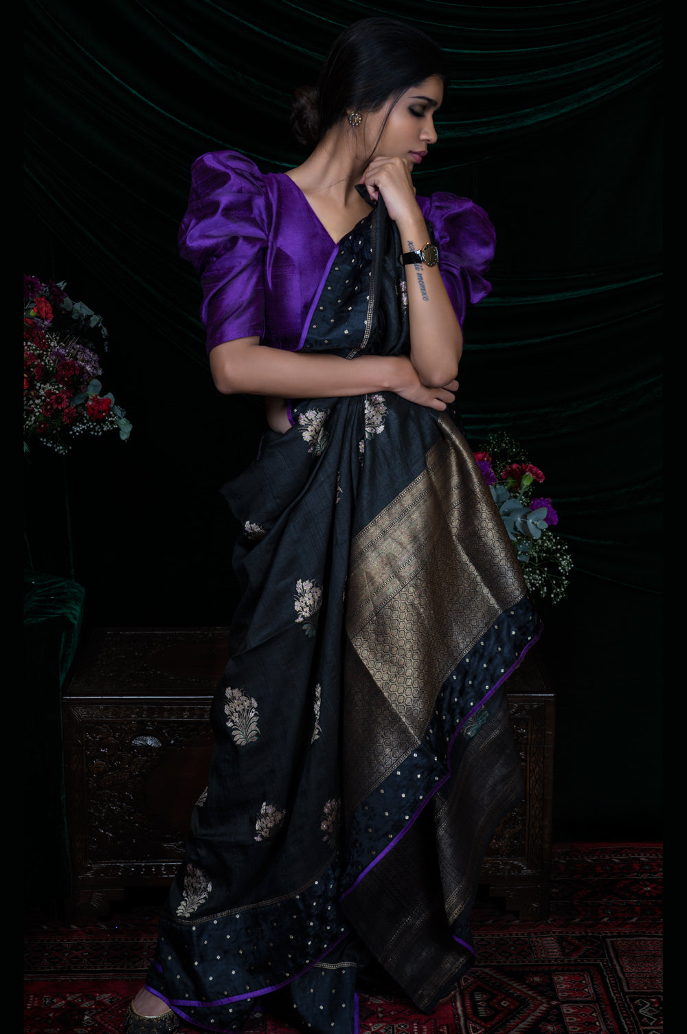 The Banarasi tussar-silk sari has stylized Mughal floral motifs and is enhanced with a zari-dotted tanchoi silk border. Purple raw silk trim on the edges further adds an element of surprise.