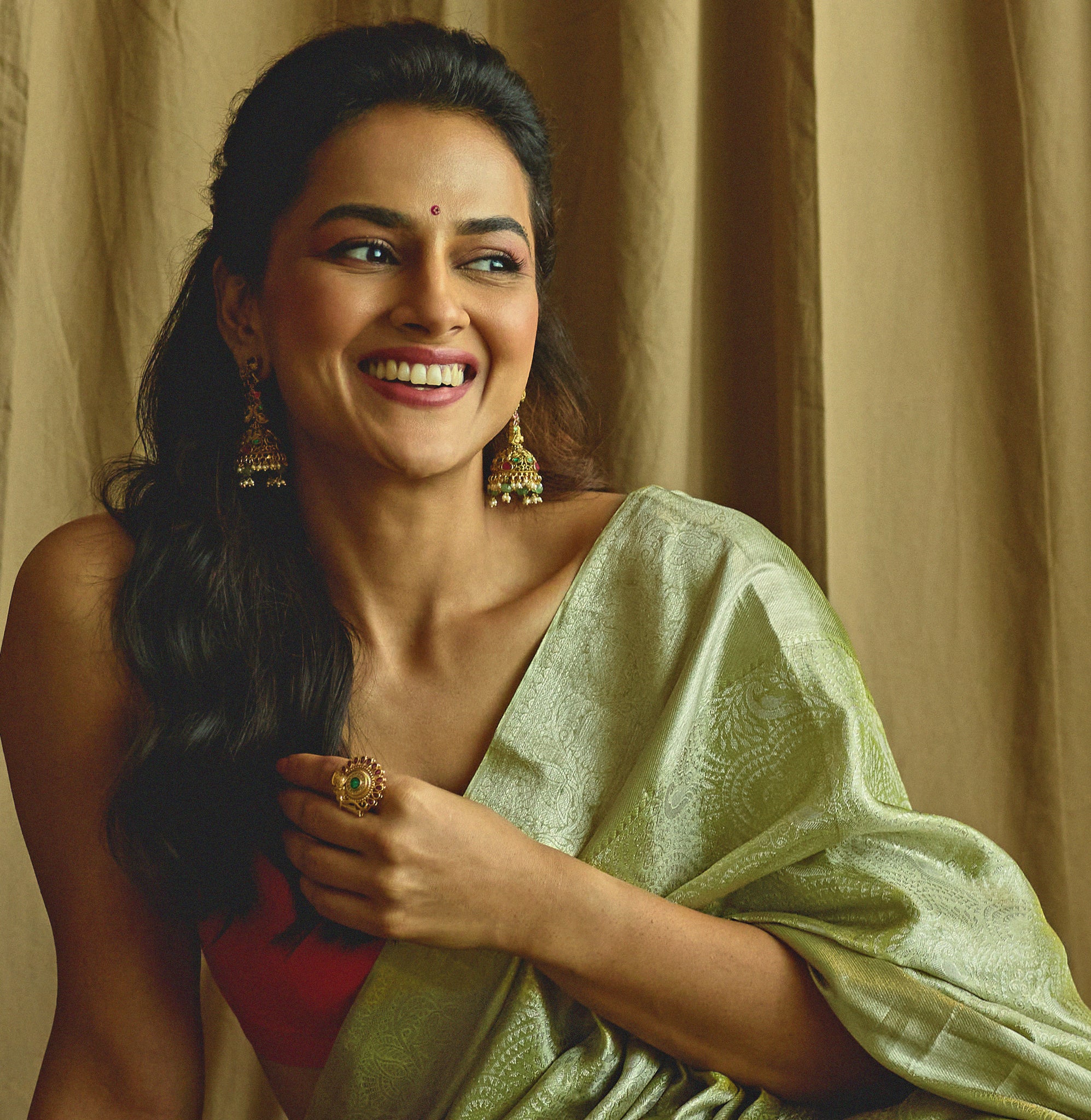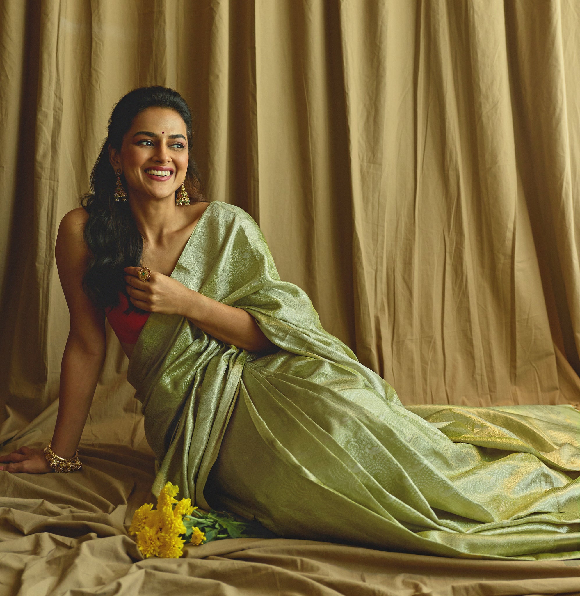 Worn by Shraddha Srinath, this Kanchipuram silk sari is a wearable sonnet in leaf-green and silver. It captures the essence of a sun-dappled fresh leaf, blending profound heritage with a fresh, modern spirit for the connoisseur of artisanal legacy.