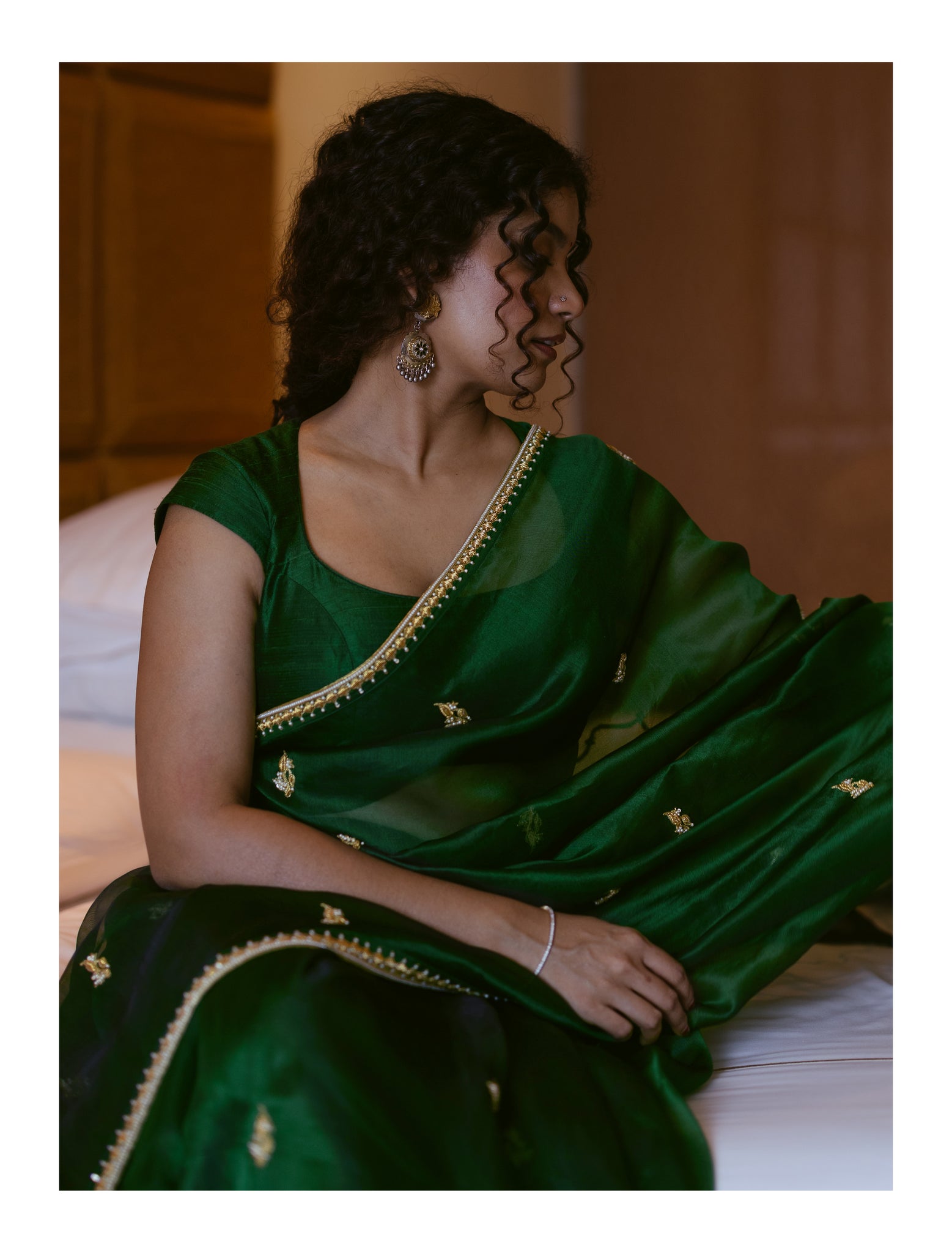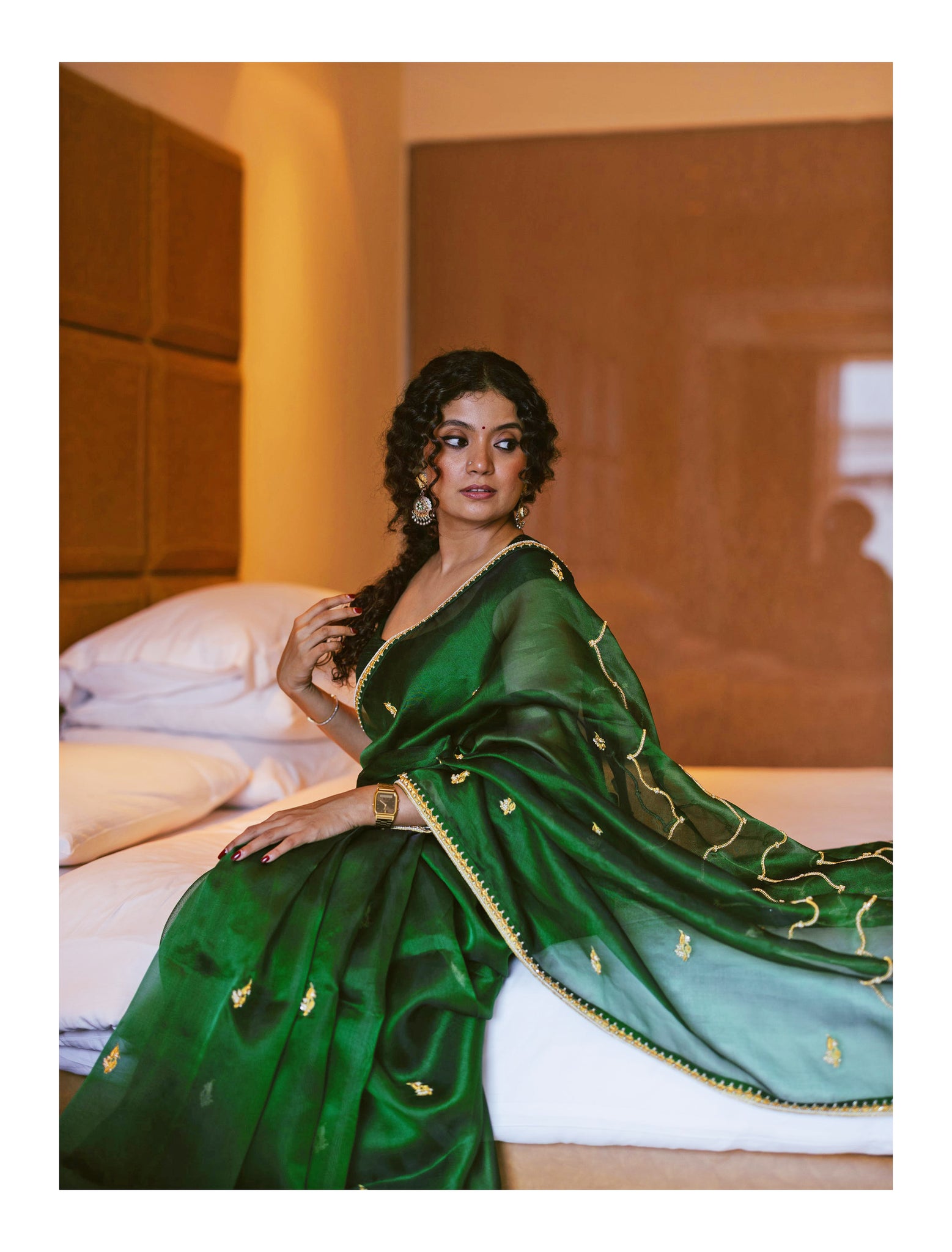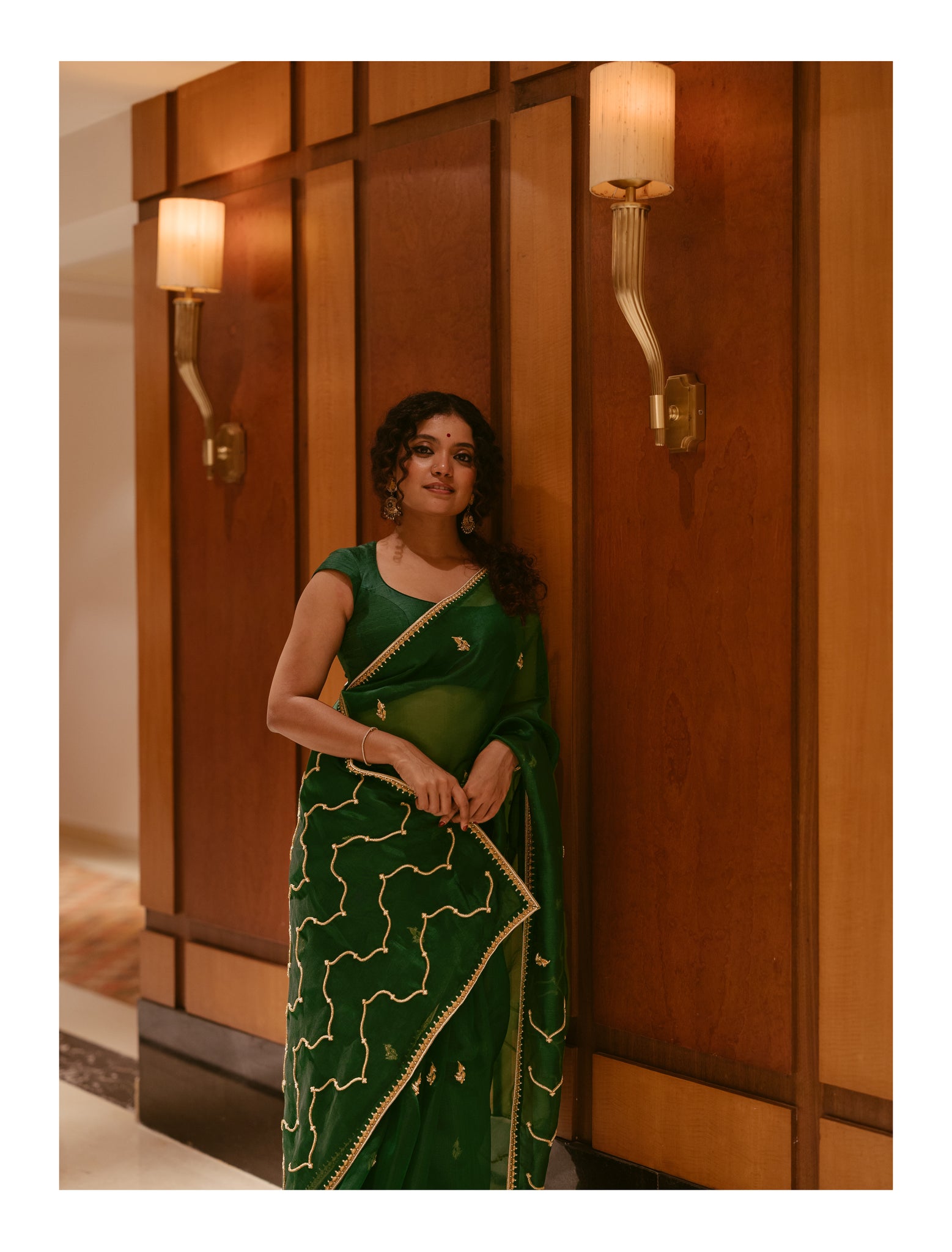 Worn by Anna Ben, this jewel-toned silk organza sari is sheer elegance redefined. For the woman who commands attention not through volume, but through impeccable, graceful detail.