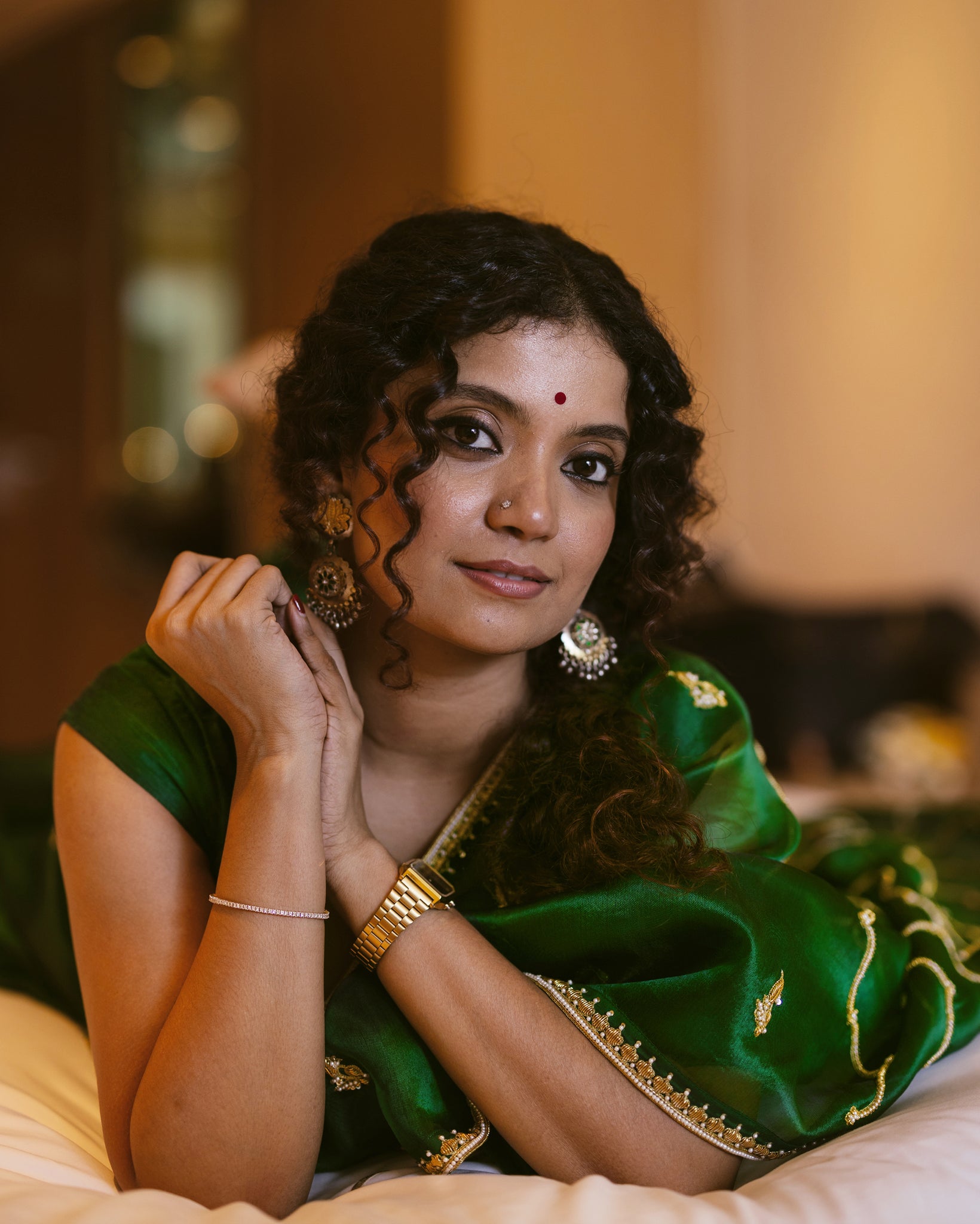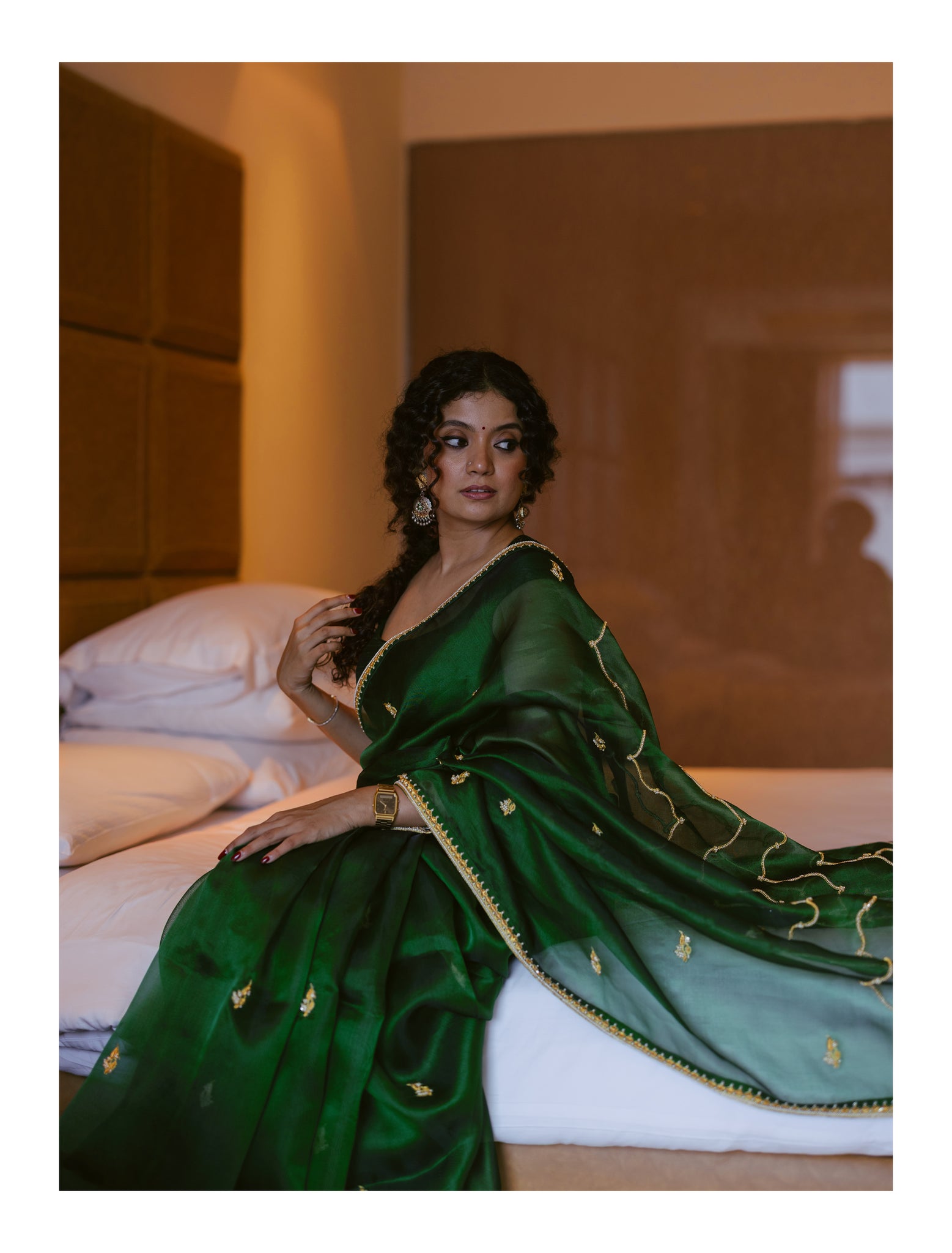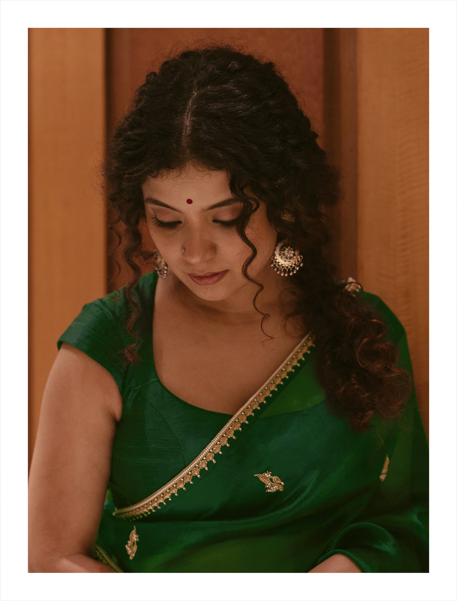 Worn by Anna Ben, this jewel-toned silk organza sari is sheer elegance redefined. For the woman who commands attention not through volume, but through impeccable, graceful detail.