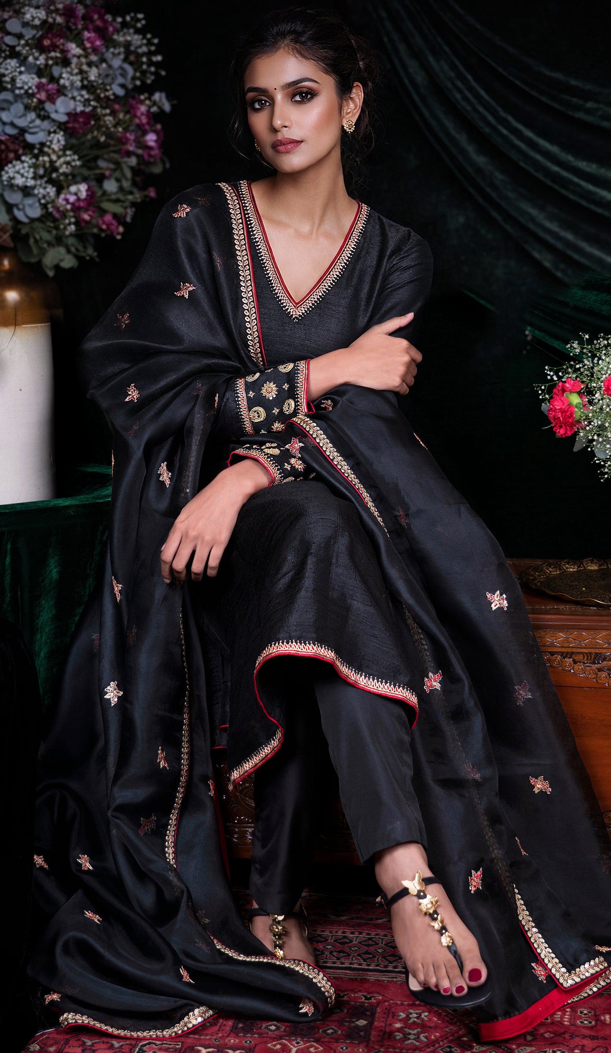 Crafted in raw silk, the handloom kurta and pants are made interesting with a zardozi hand-embroidered cuff in a pattern incorporating the crescent moon, sunflowers, stars, and leaves.