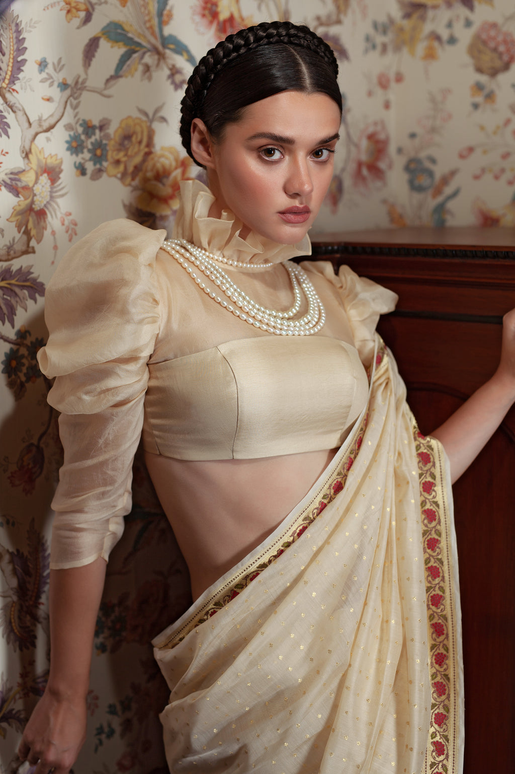 The new capsule collection is all about reinterpreting heritage and the royal splendor of a regal era. It expresses an ethereal air of timeless feminity through natural handwoven textiles adorned with liberal applications of delicate pearls, hand-embroidered motifs, a wave of ruffles, and soft surface detail in timeless colors like brown, emerald green, rich cream, pearly white, and gold.