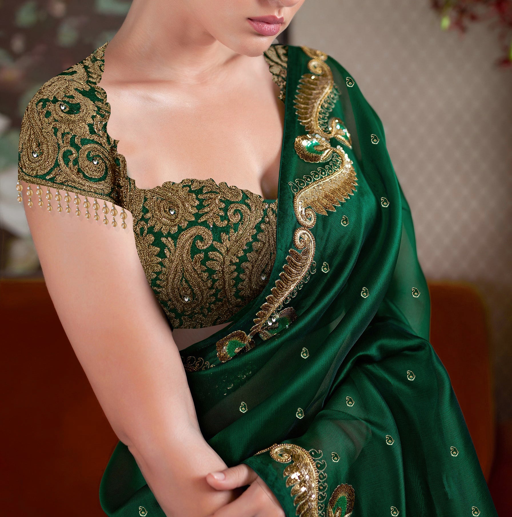 The exquisite blouse in green silk is made stunning with sari hand embroidery. Wear yours with our Jardin de Jaipur sari.