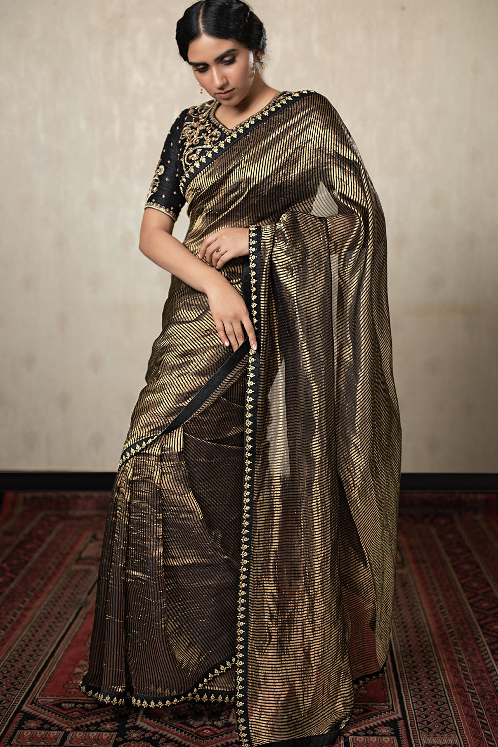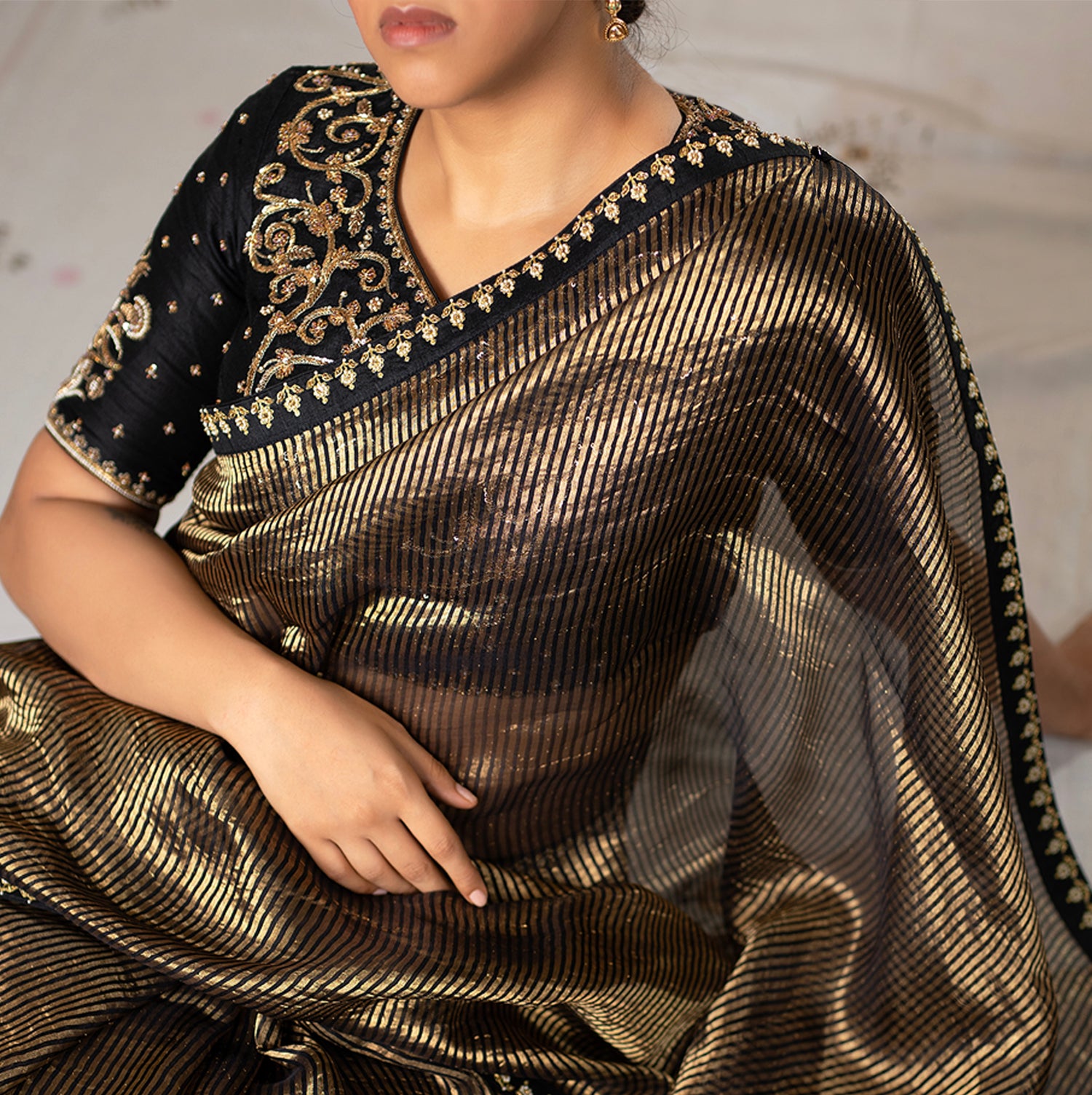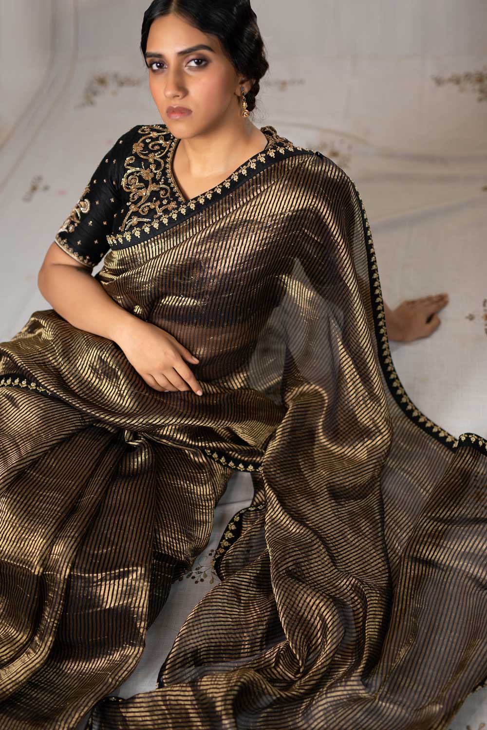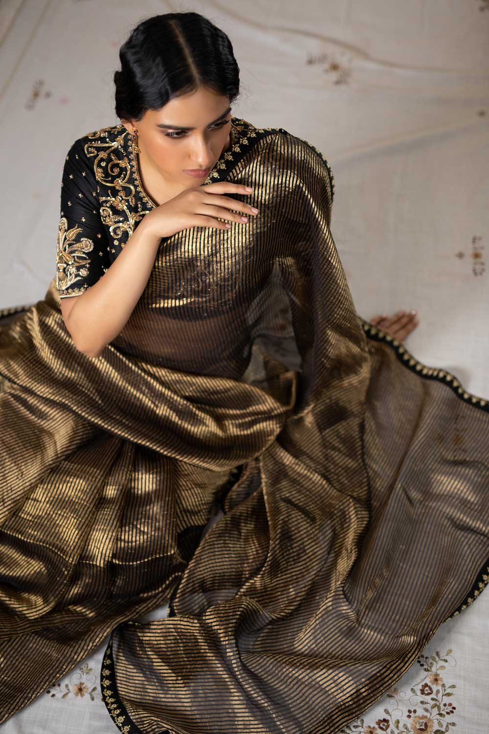 Sari    The exquisite sari, handwoven at the brand's Chanderi looms using the region's same time-honoured techniques, beautifully catches the light as it moves. Our signature hand-embroidered floral border further enhances its beauty.    Tissue striped pattern   Aari...Read more