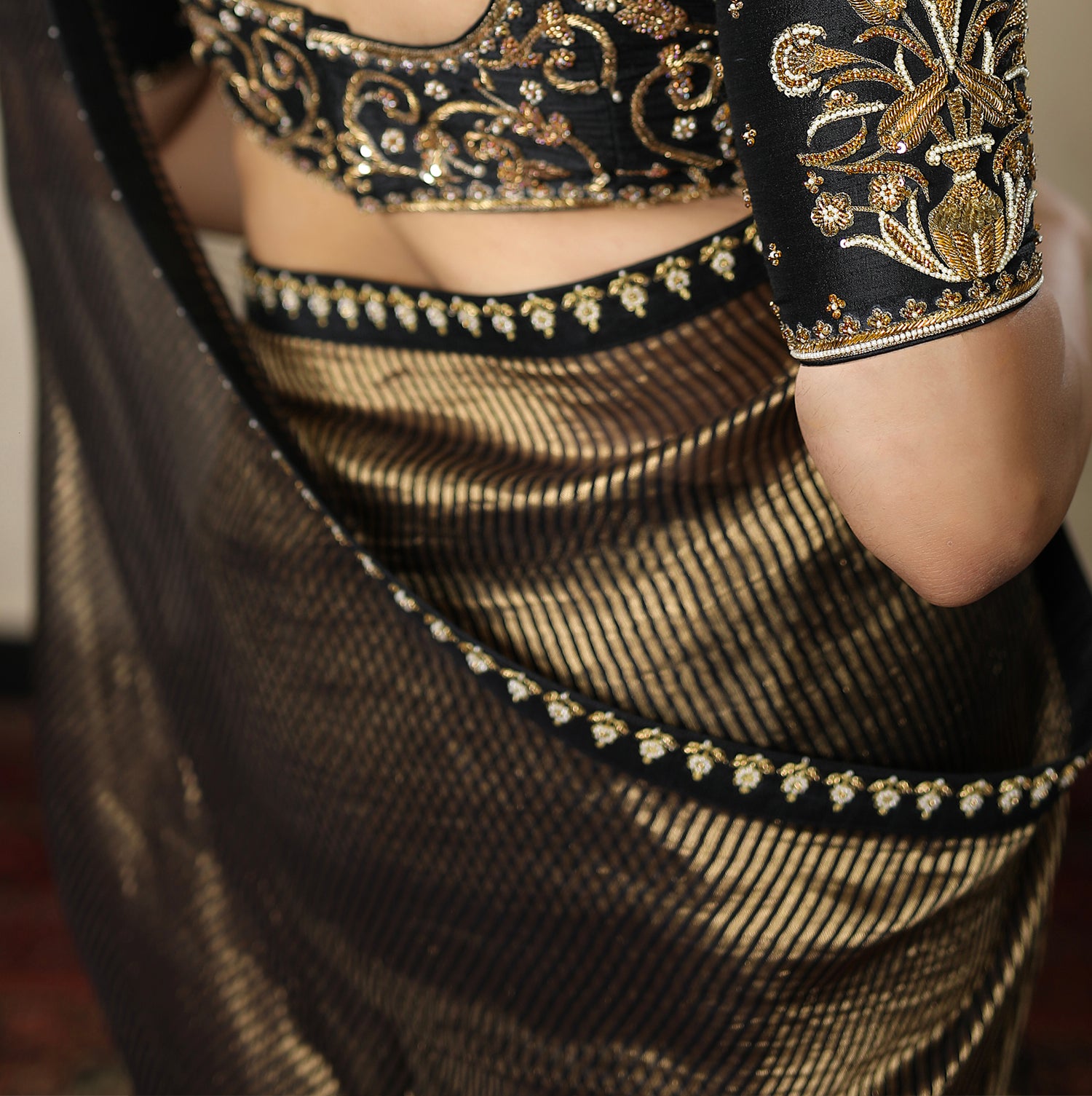 • Aari and Zardozi hand-embroidered border with delicate pearls