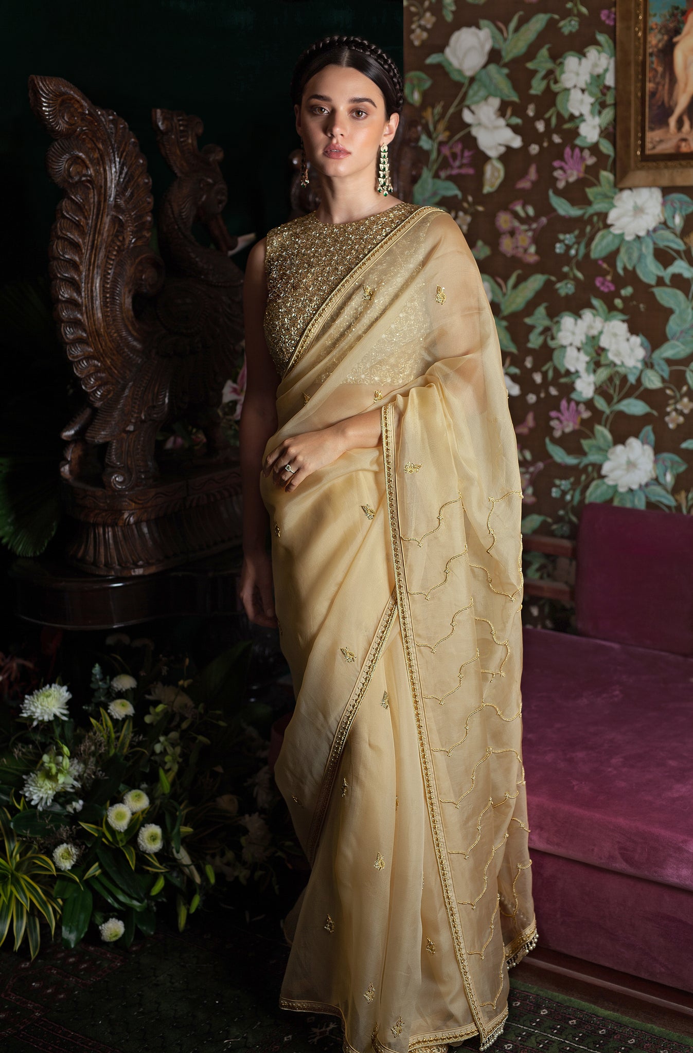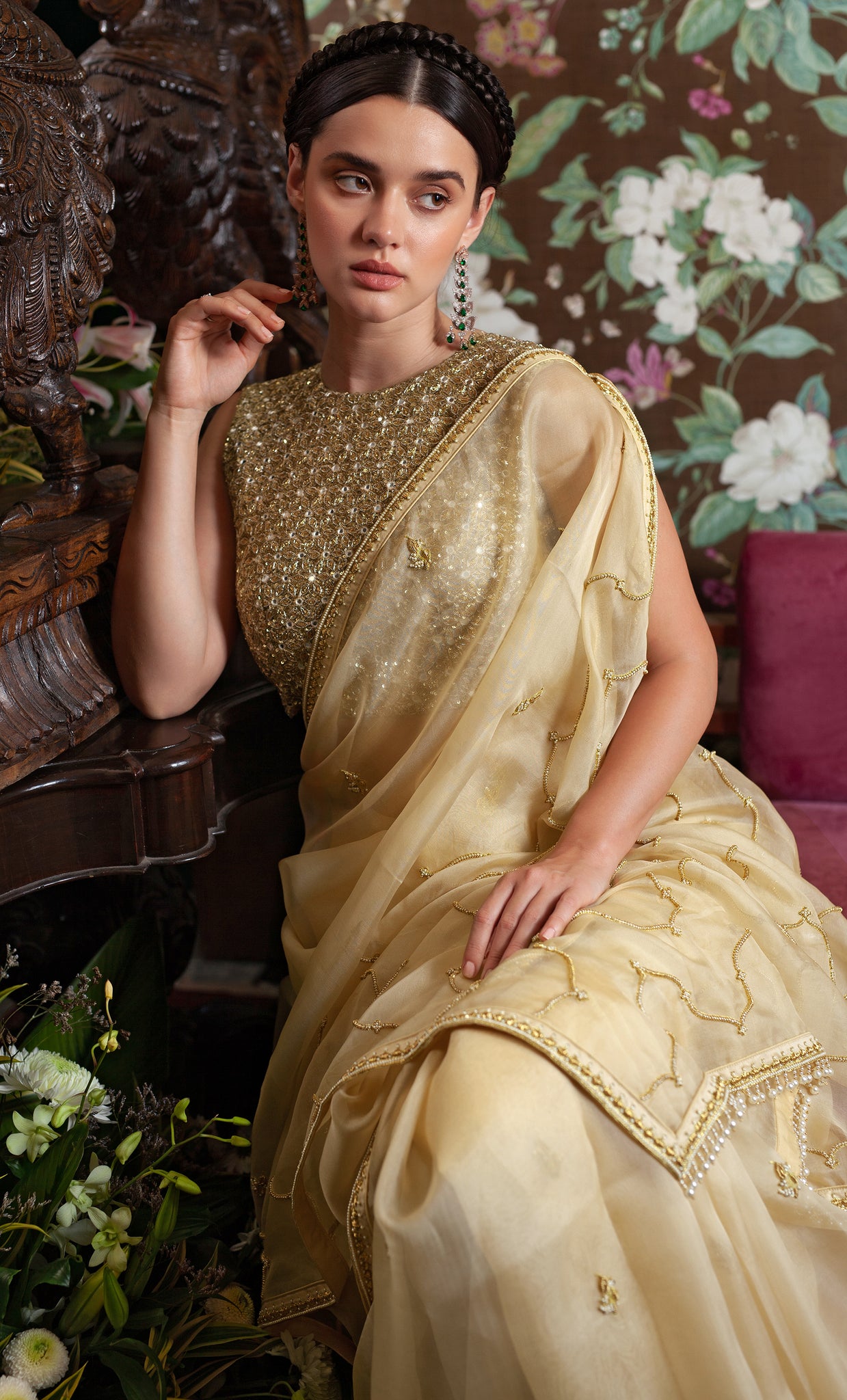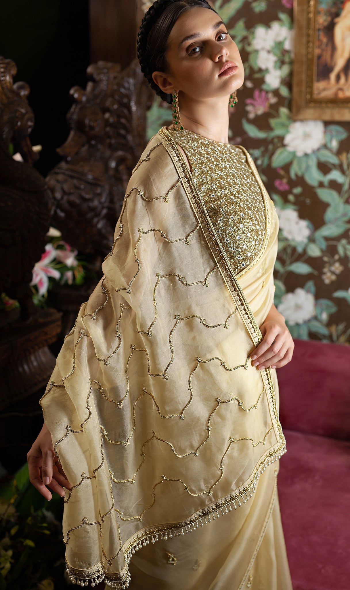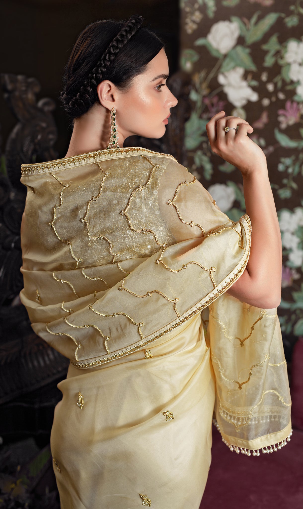 SARI Reference: SJSS22-FE-0033 Fabric: Organza Composition: 100% Silk Type: Woven Surface ornamentation: Hand Embroidery in a dome pattern inspired by the Amber fort. Technique: Zardozi, couching and aari  Embroidered areas: Borders, all-over and end-panel Tassels: Pearl tassels Availability: Ready-to-Ship Delivery time: Domestic delivery in 7-9 days...Read more