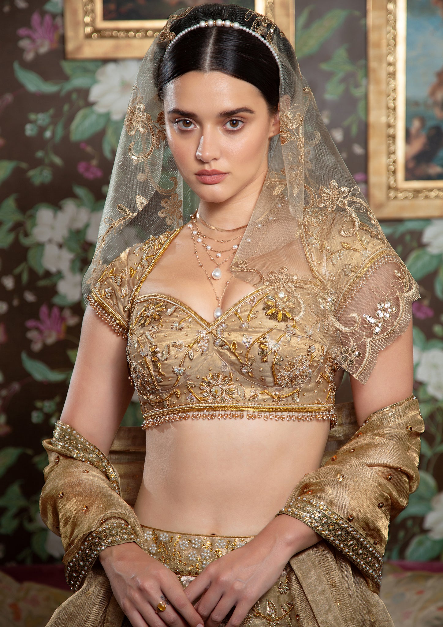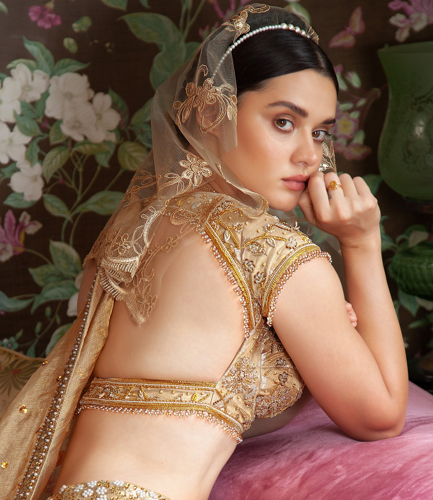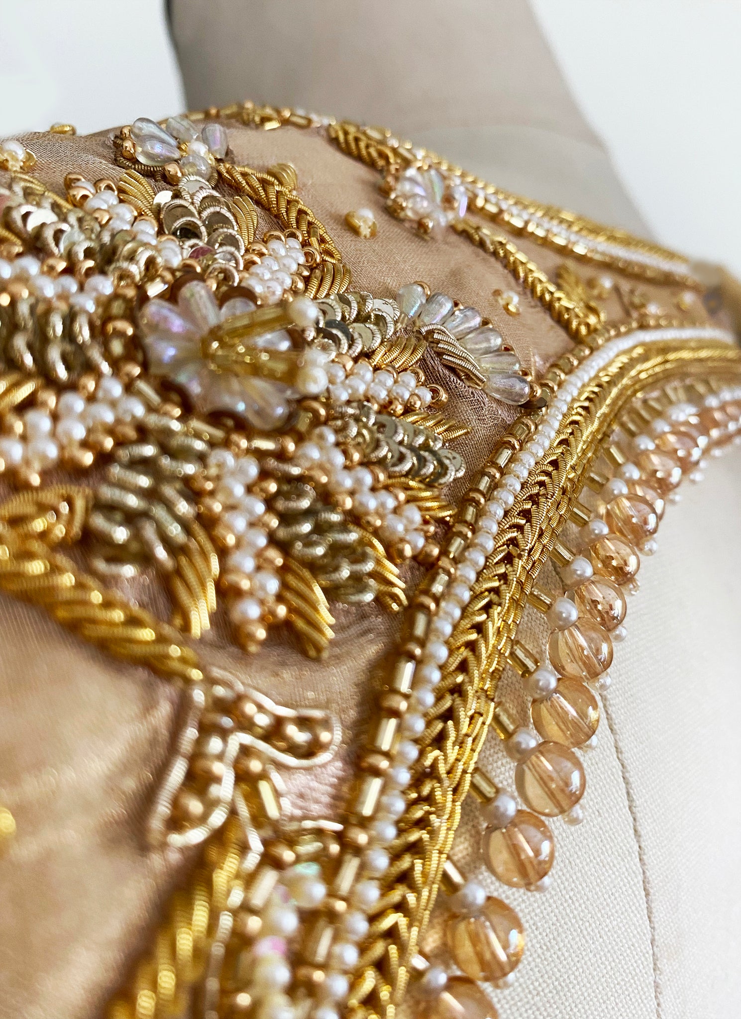 - Hand embroidered using zardozi in three shades of gold and natural pearls
