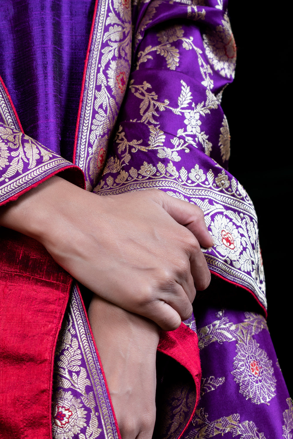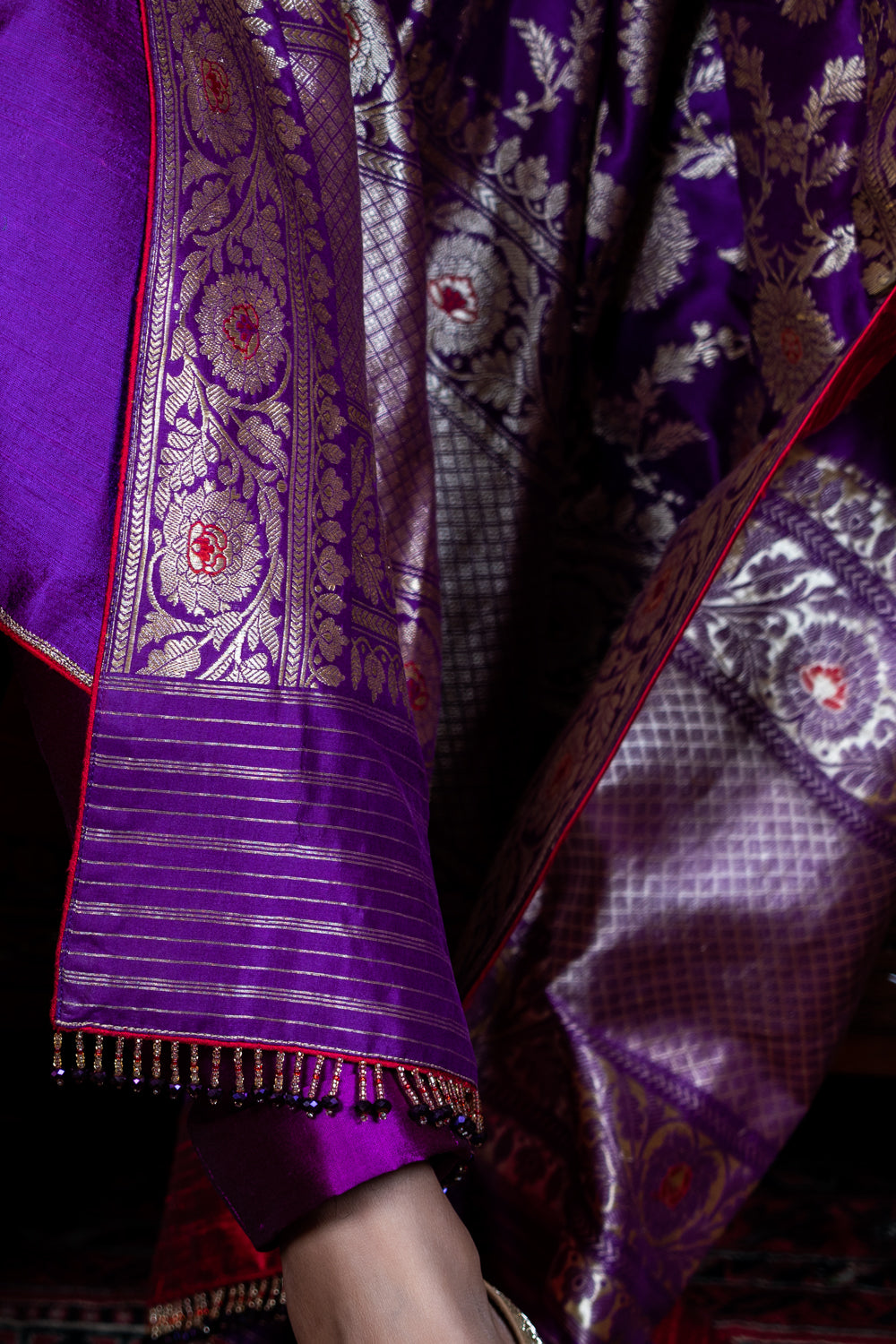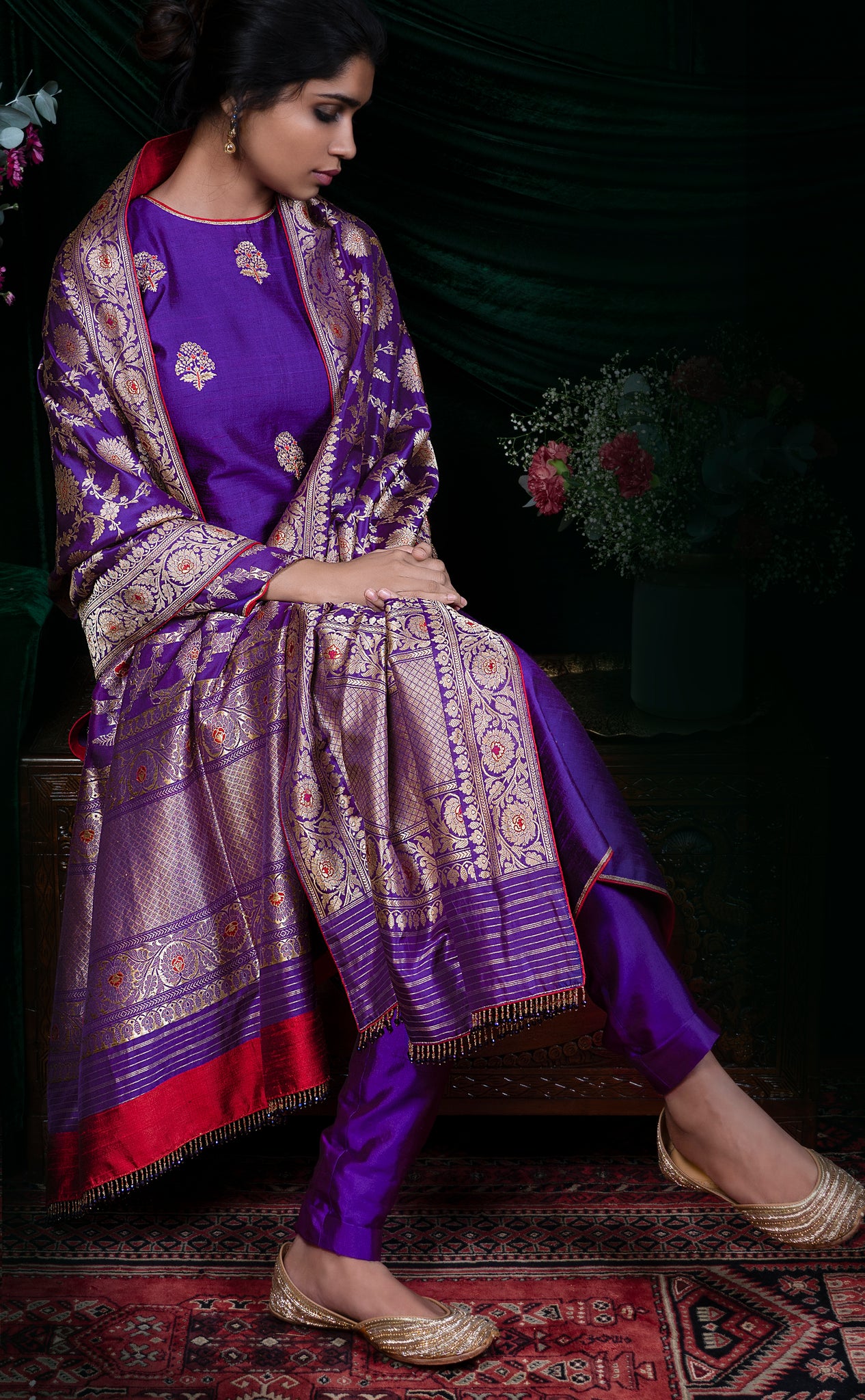 Dupatta The Banarasi dupatta in eminence violet has been meticulously handwoven in Varanasi from pure silk yarns in an intricate floral jacquard pattern incorporating creepers and marigold flowers. It is further enhanced with deep red raw-silk trim and beaded tassels...Read more