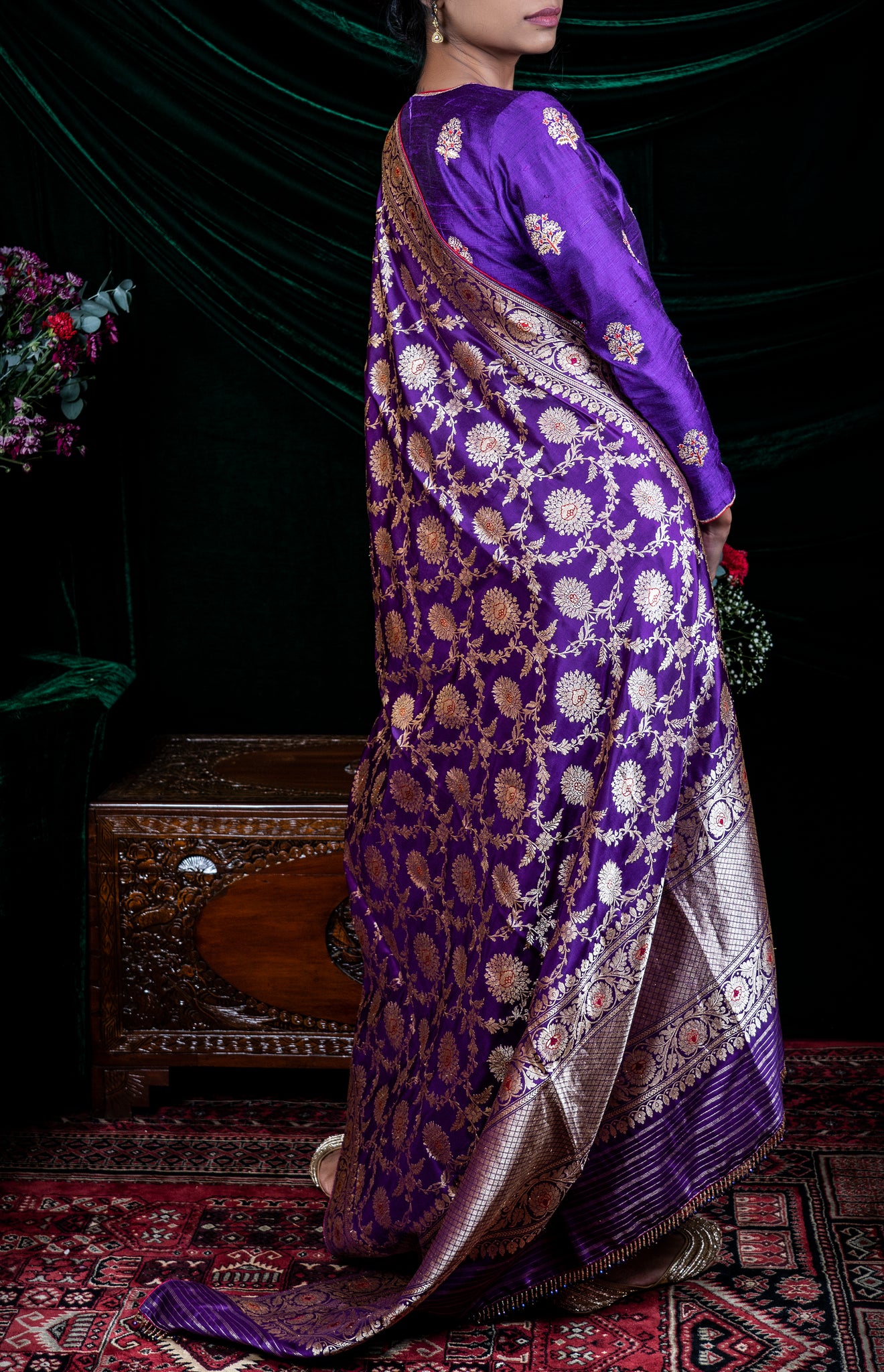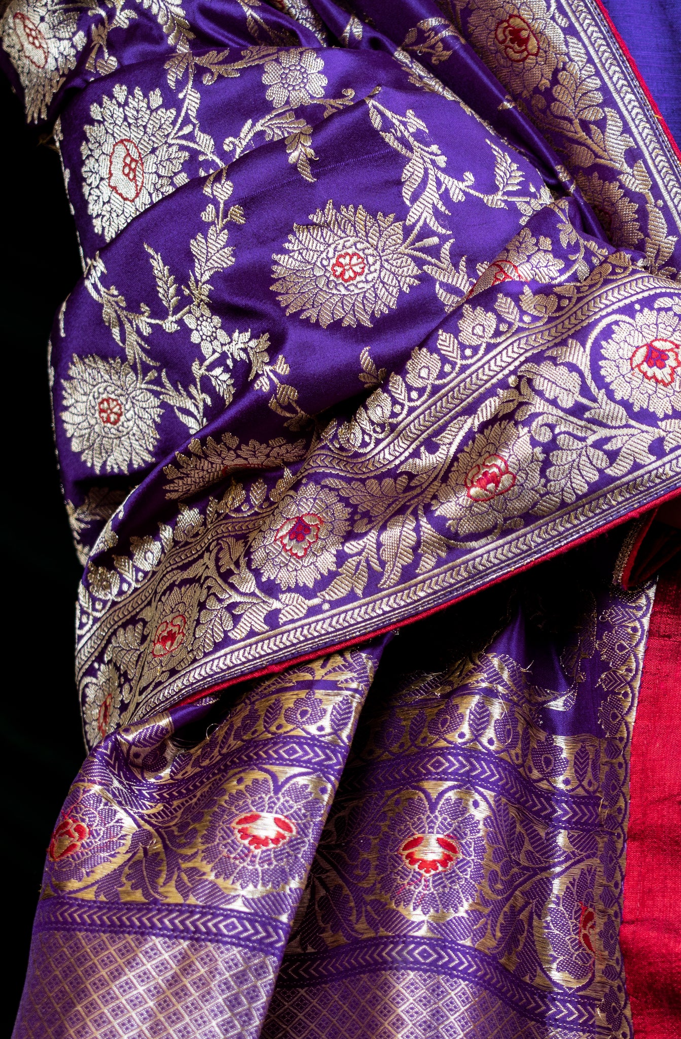 The Banarasi dupatta in eminence violet has been meticulously handwoven in Varanasi from pure silk yarns in an intricate floral jacquard pattern incorporating creepers and marigold flowers. It is further enhanced with deep red raw-silk trim and beaded tassels -- an elegant choice for special occasions.