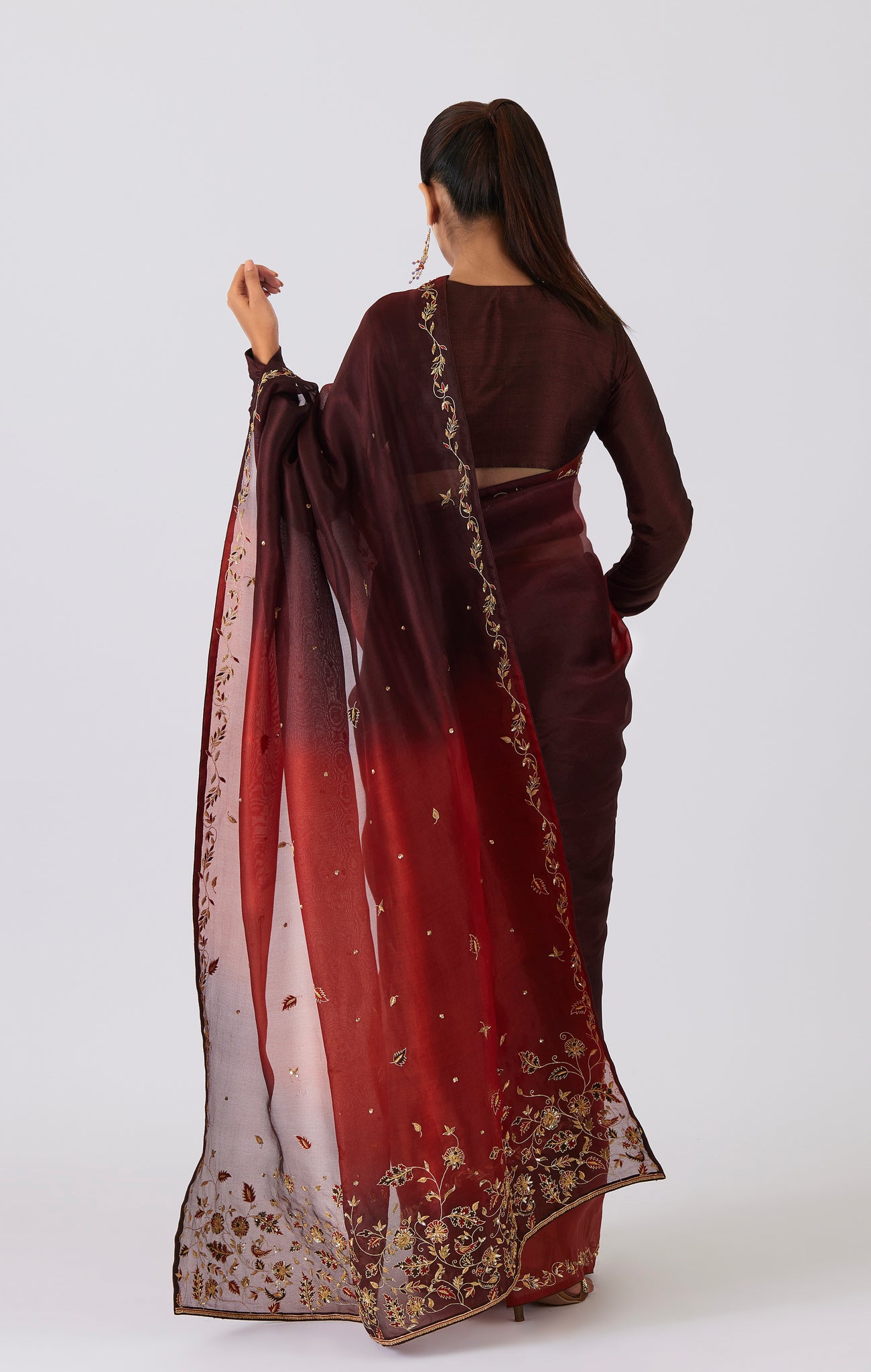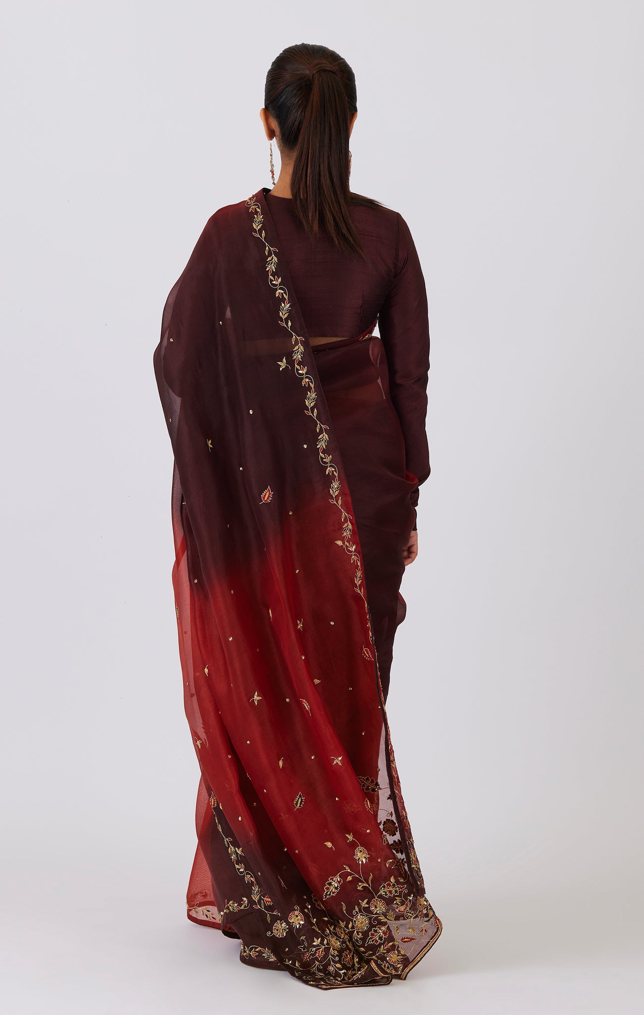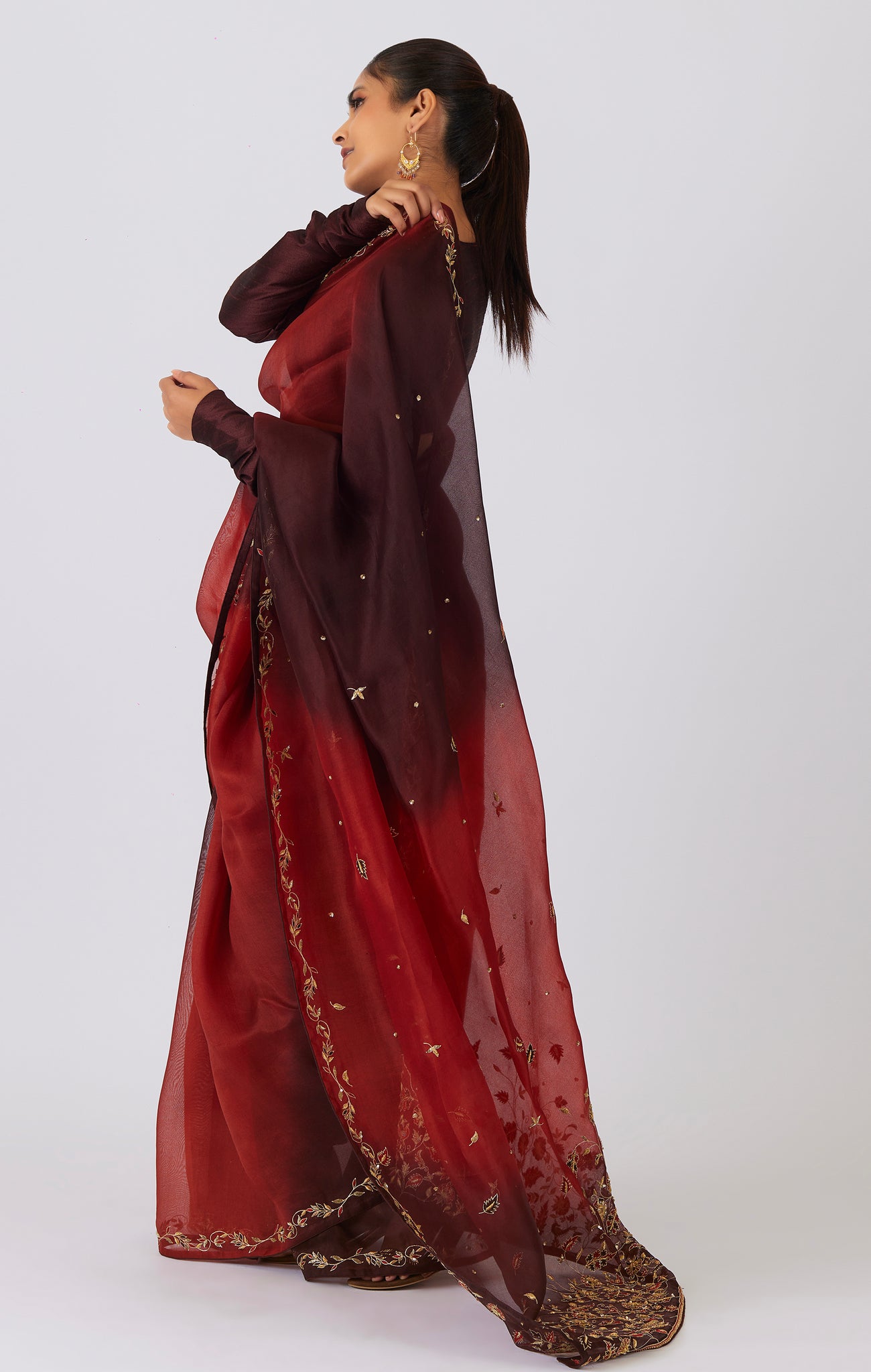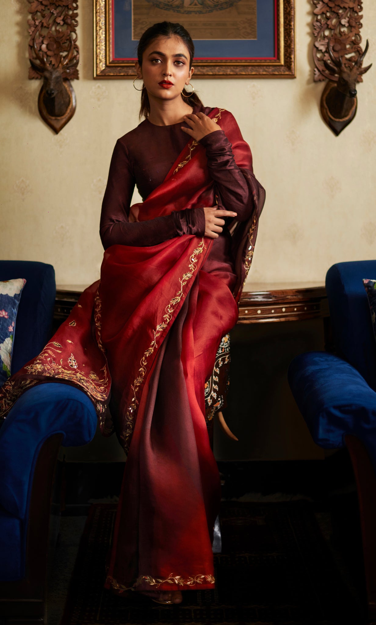 The exceptional colour palette of brown and rust creates a stunning ombré effect that adds a unique twist to this sari. The fusion of rich colors, luxurious fabric, intricate hand-embroidered borders and an ornamental end panel transforms this piece into a wearable work of art. The lightweight silk organza fabric allows you to move easily, ensuring that you feel elegant and comfortable throughout any occasion.