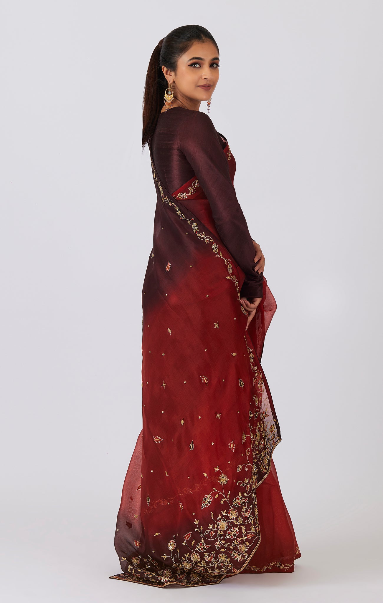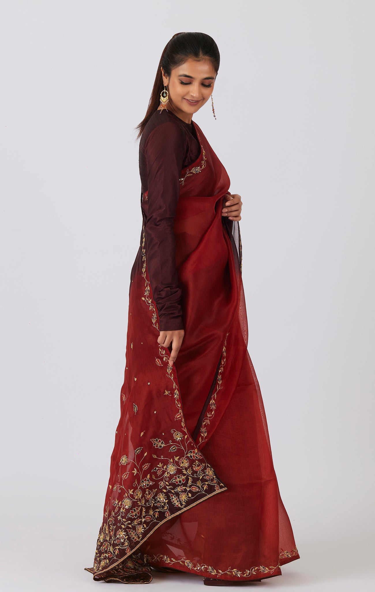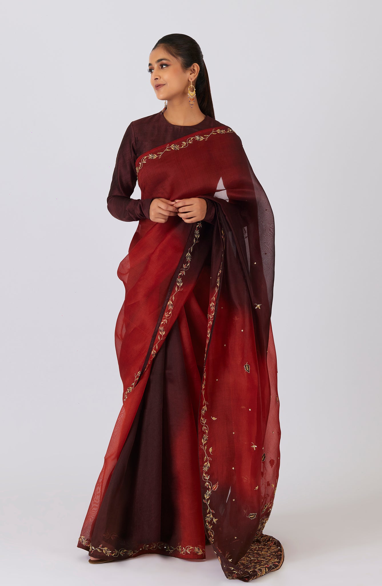 The exceptional colour palette of brown and rust creates a stunning ombré effect that adds a unique twist to this sari. The fusion of rich colors, luxurious fabric, intricate hand-embroidered borders and an ornamental end panel transforms this piece into a wearable work of art. The lightweight silk organza fabric allows you to move easily, ensuring that you feel elegant and comfortable throughout any occasion.