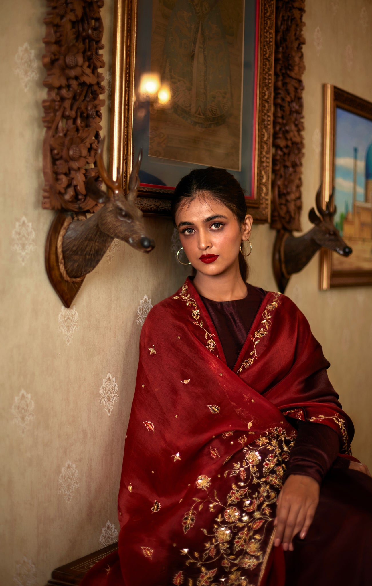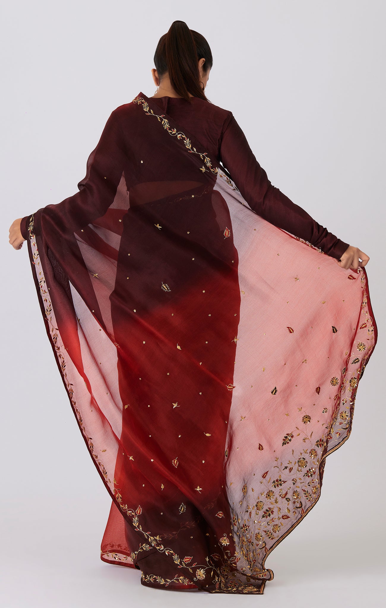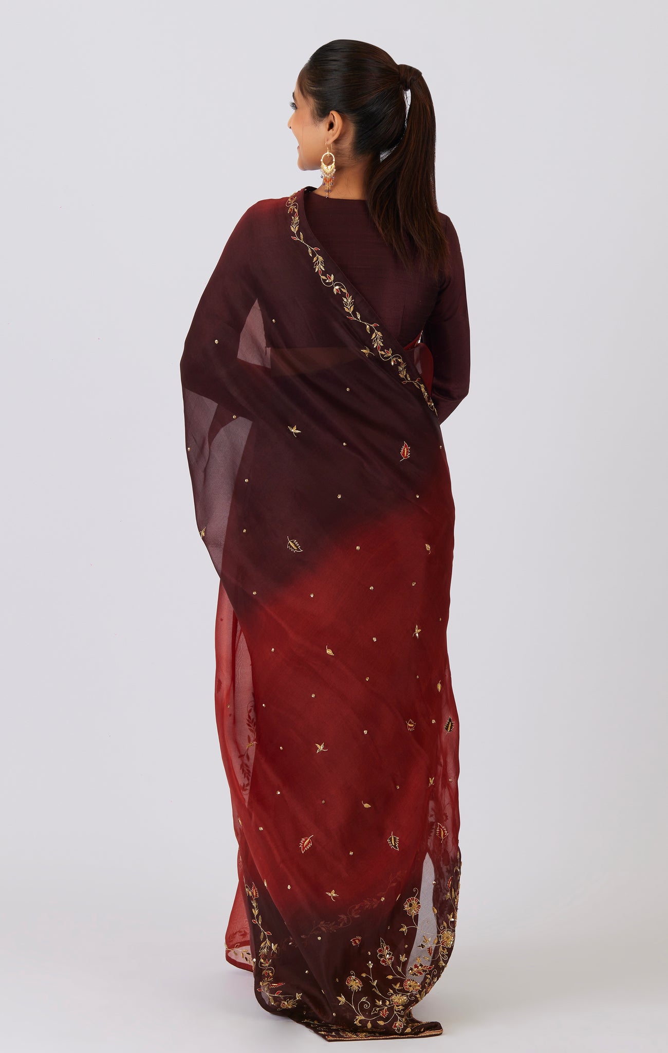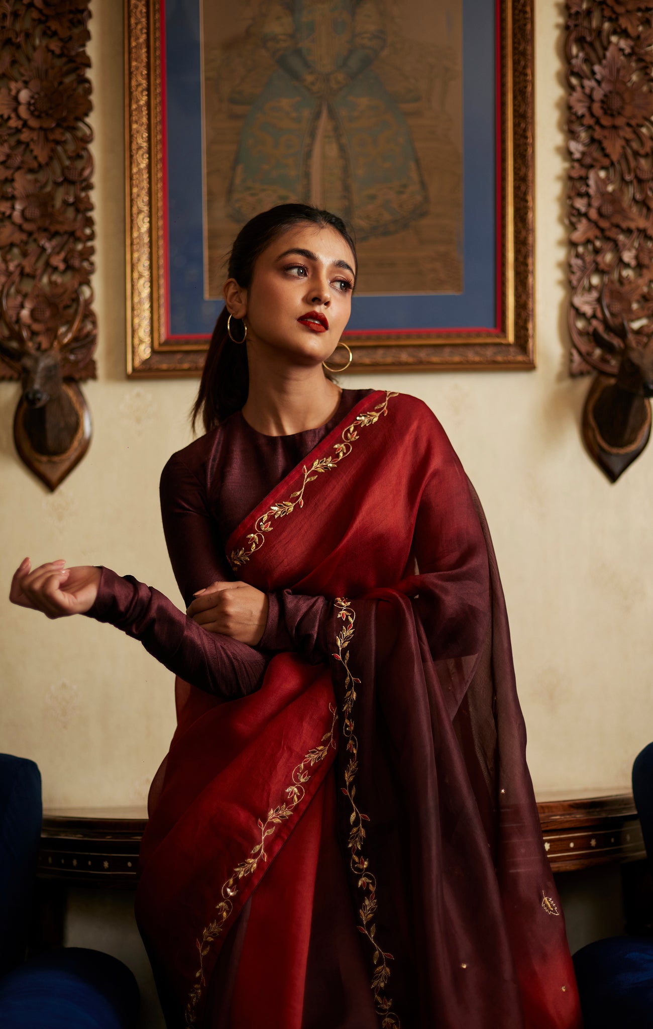 The exceptional colour palette of brown and rust creates a stunning ombré effect that adds a unique twist to this sari. The fusion of rich colors, luxurious fabric, intricate hand-embroidered borders and an ornamental end panel transforms this piece into a wearable work of art. The lightweight silk organza fabric allows you to move easily, ensuring that you feel elegant and comfortable throughout any occasion.