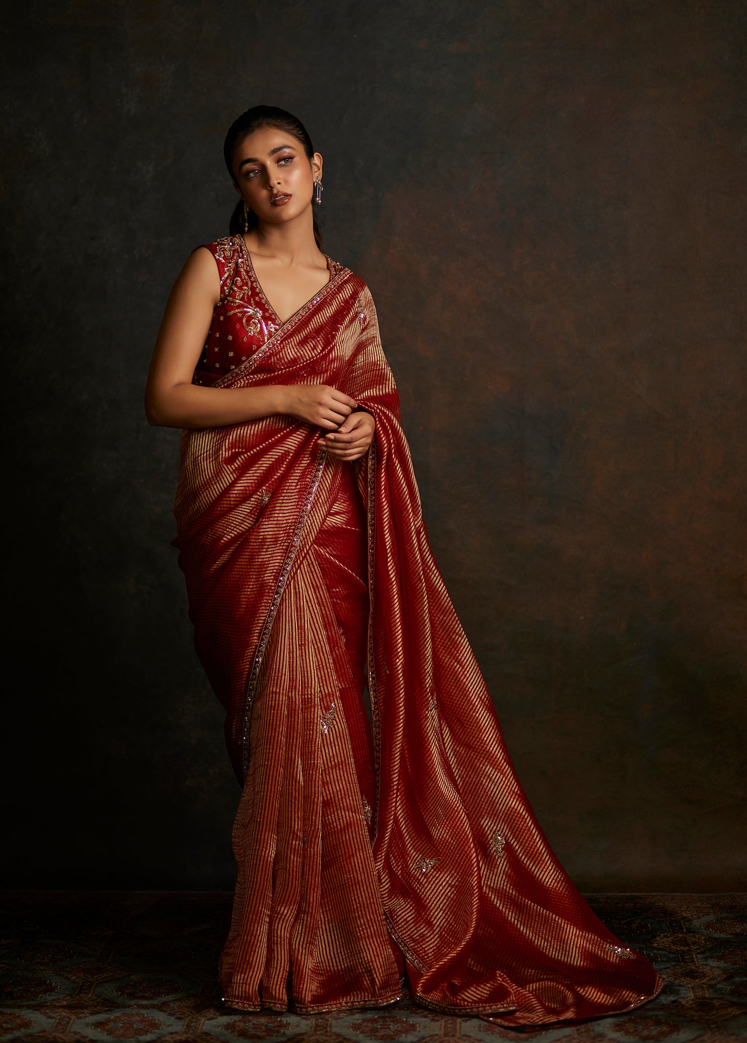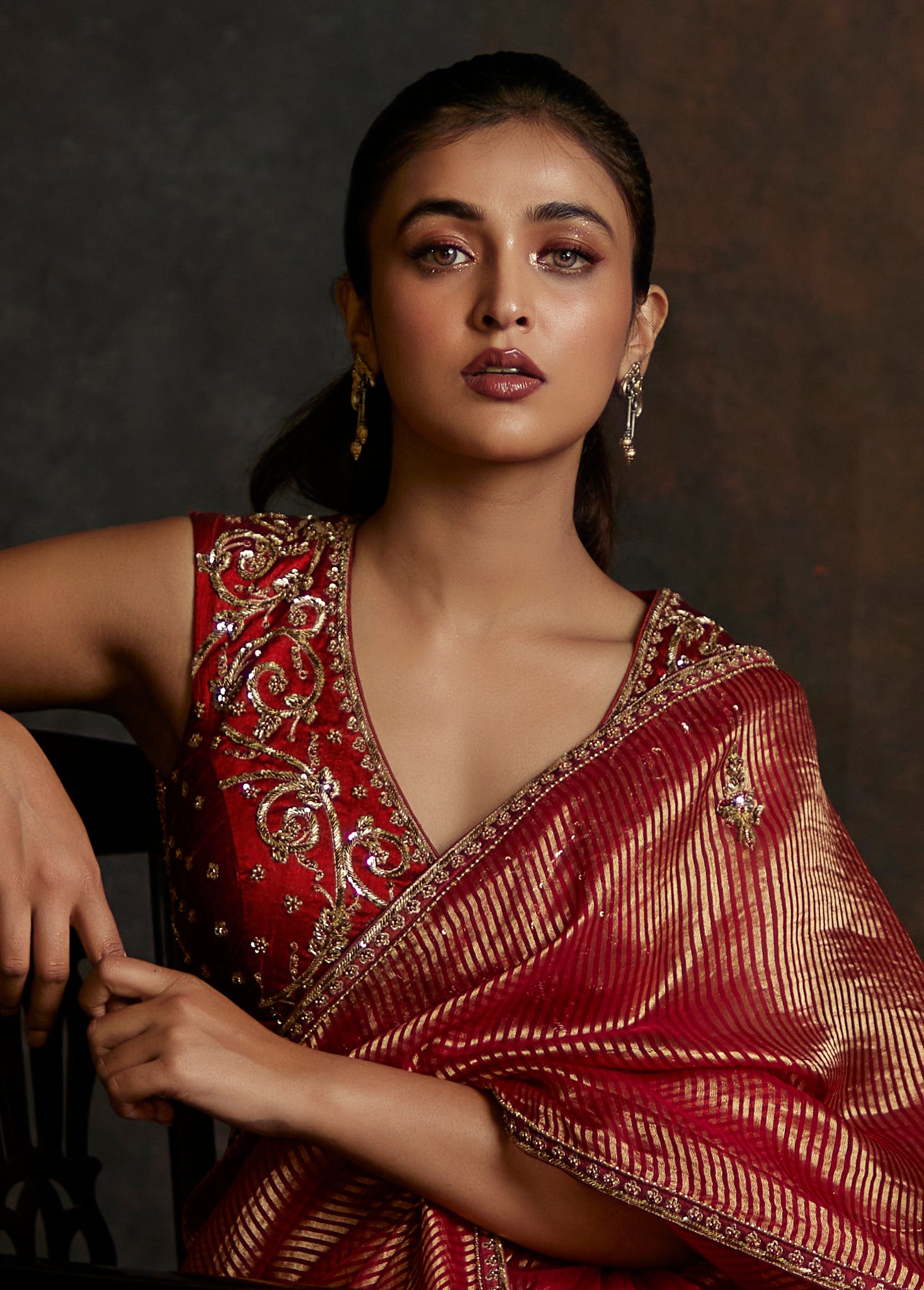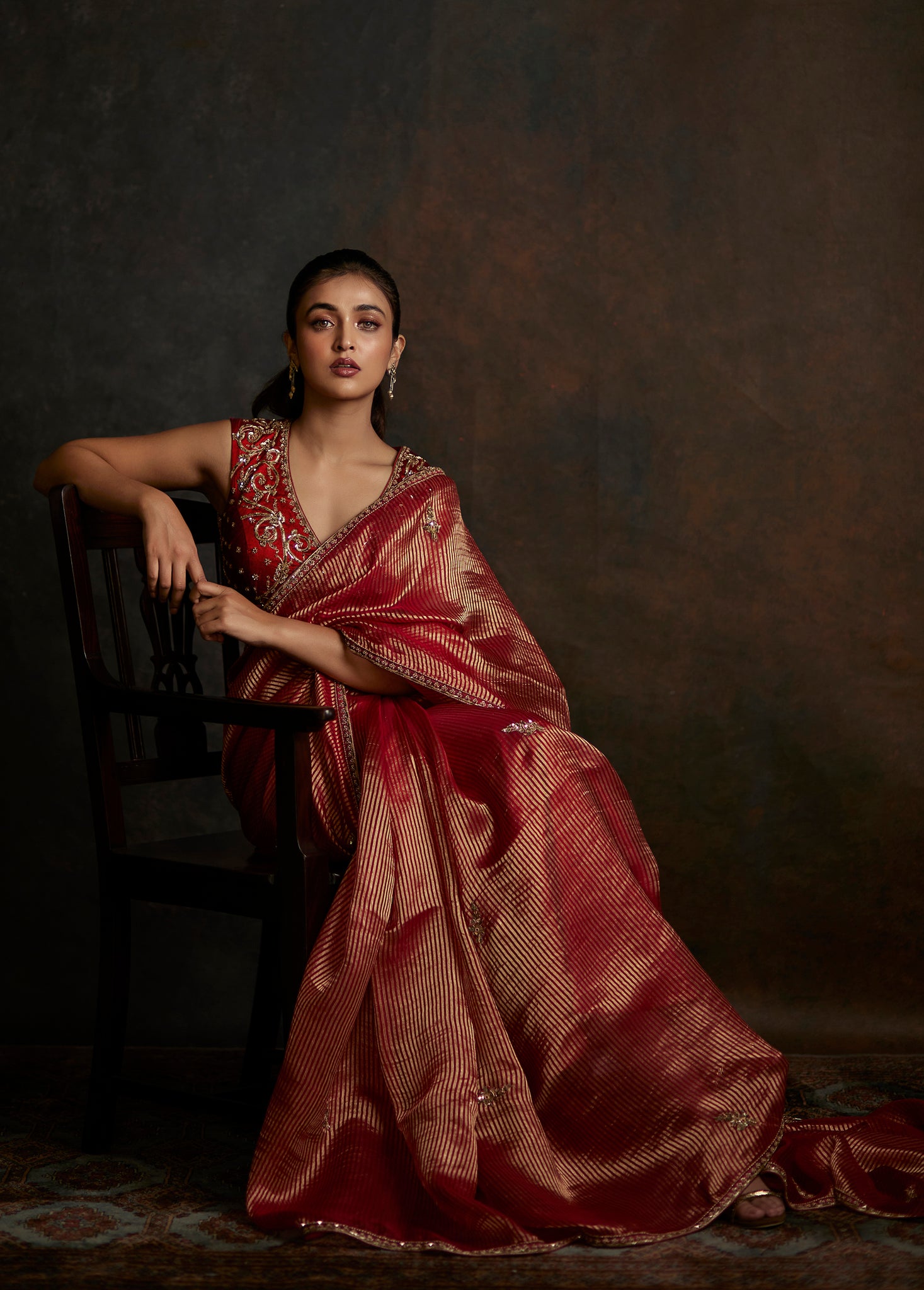 The exquisite sari, handwoven at the brand's Chanderi looms using the region's same time-honoured techniques, beautifully catches the light as it moves. Our signature hand-embroidered zardozi floral border and all-over motifs further enhance its beauty.
