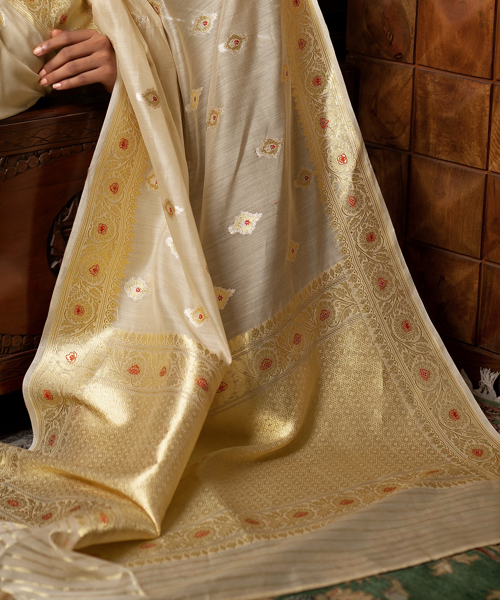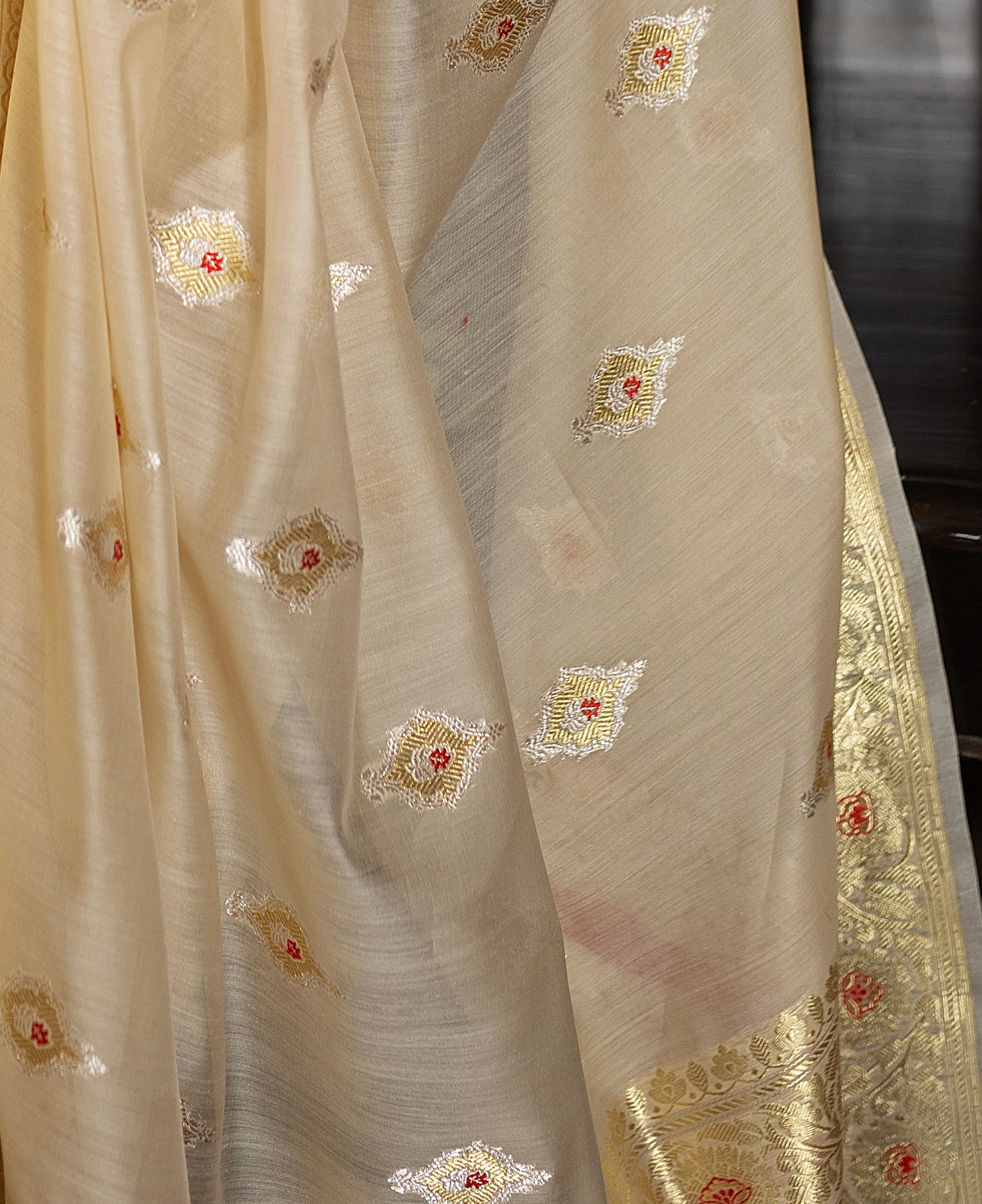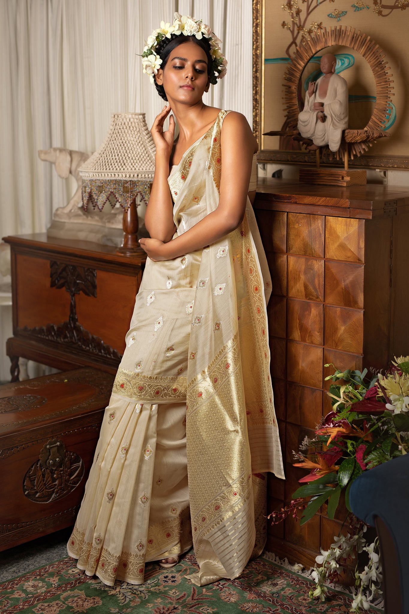 Meticulously handwoven by the skilled weavers of Varanasi using traditional craft techniques, the sari is an amalgamation of the richness of Banaras and the subtleness of Kerala. The lightweight sari is woven from silk cotton and patterned with iridescent light gold and silver zari motifs, enhanced with red minakari.