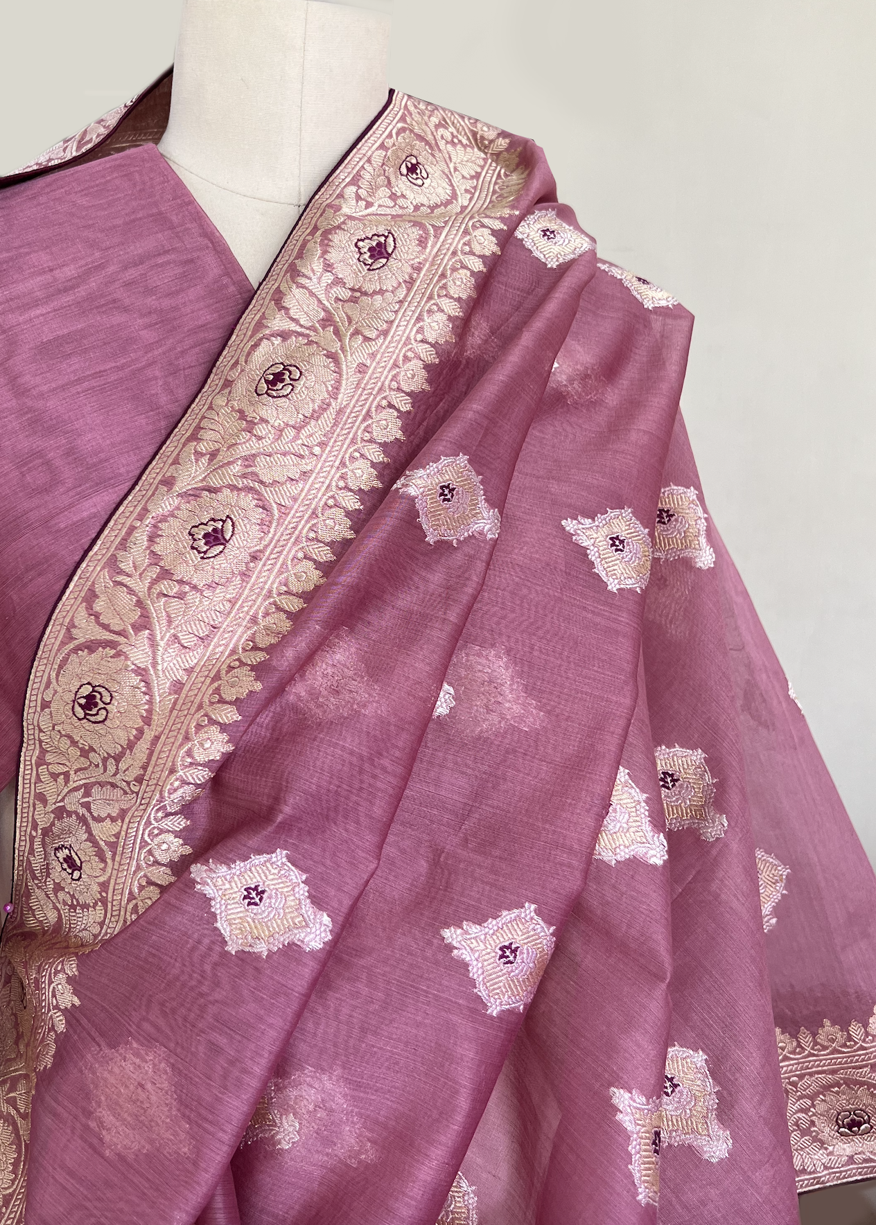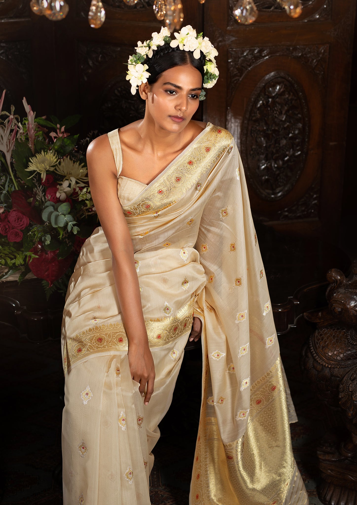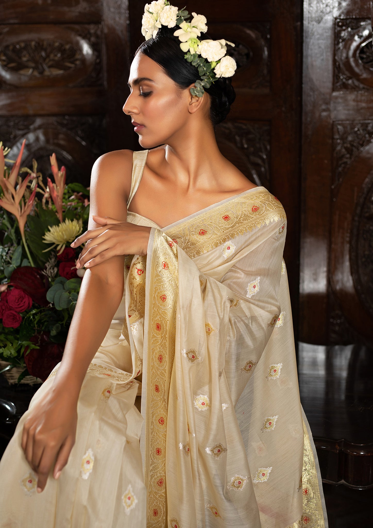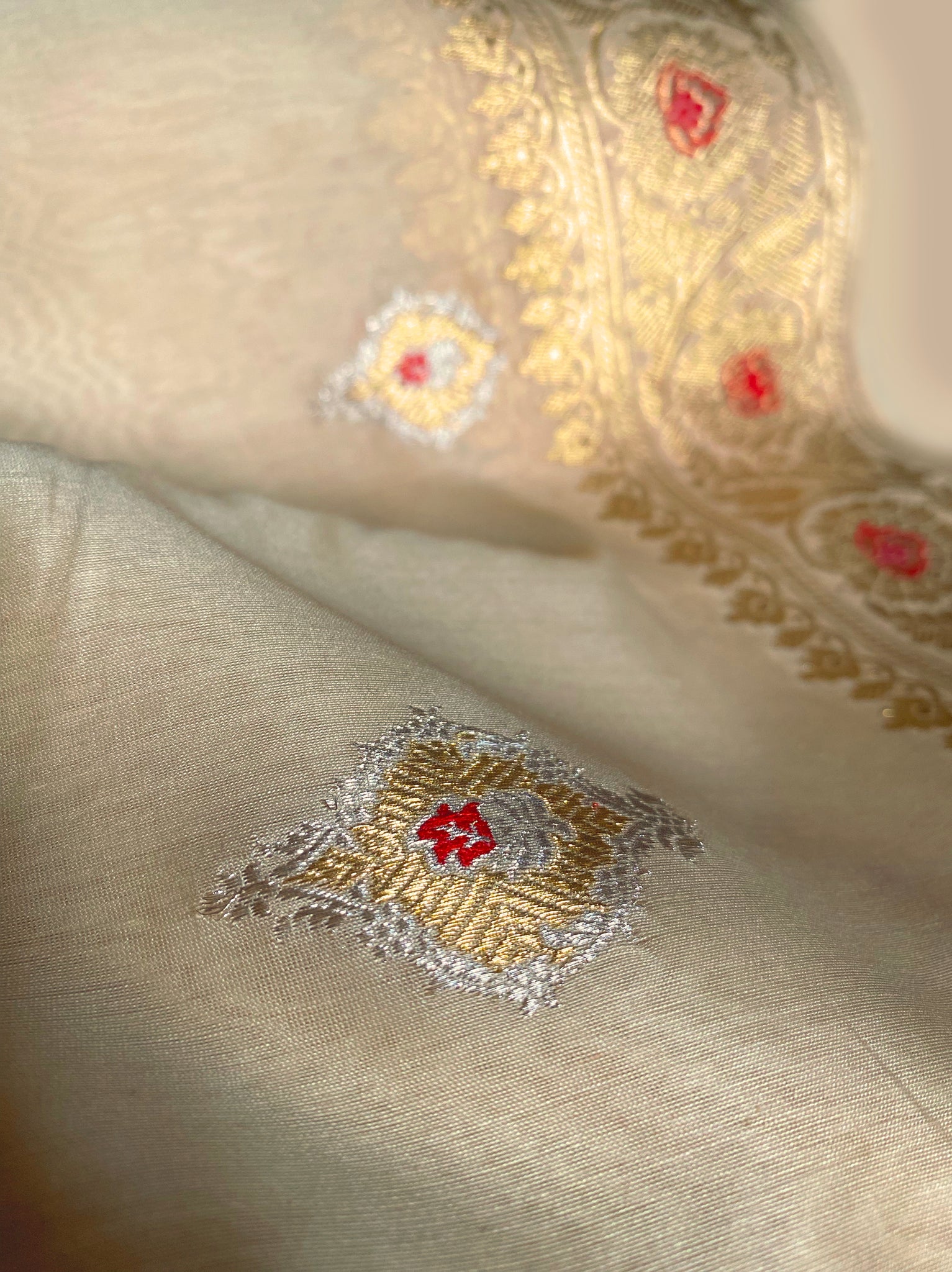 Meticulously handwoven by the skilled weavers of Varanasi using traditional craft techniques, the sari is an amalgamation of the richness of Banaras and the subtleness of Kerala. The lightweight sari is woven from silk cotton and patterned with iridescent light gold and silver zari motifs, enhanced with red minakari.