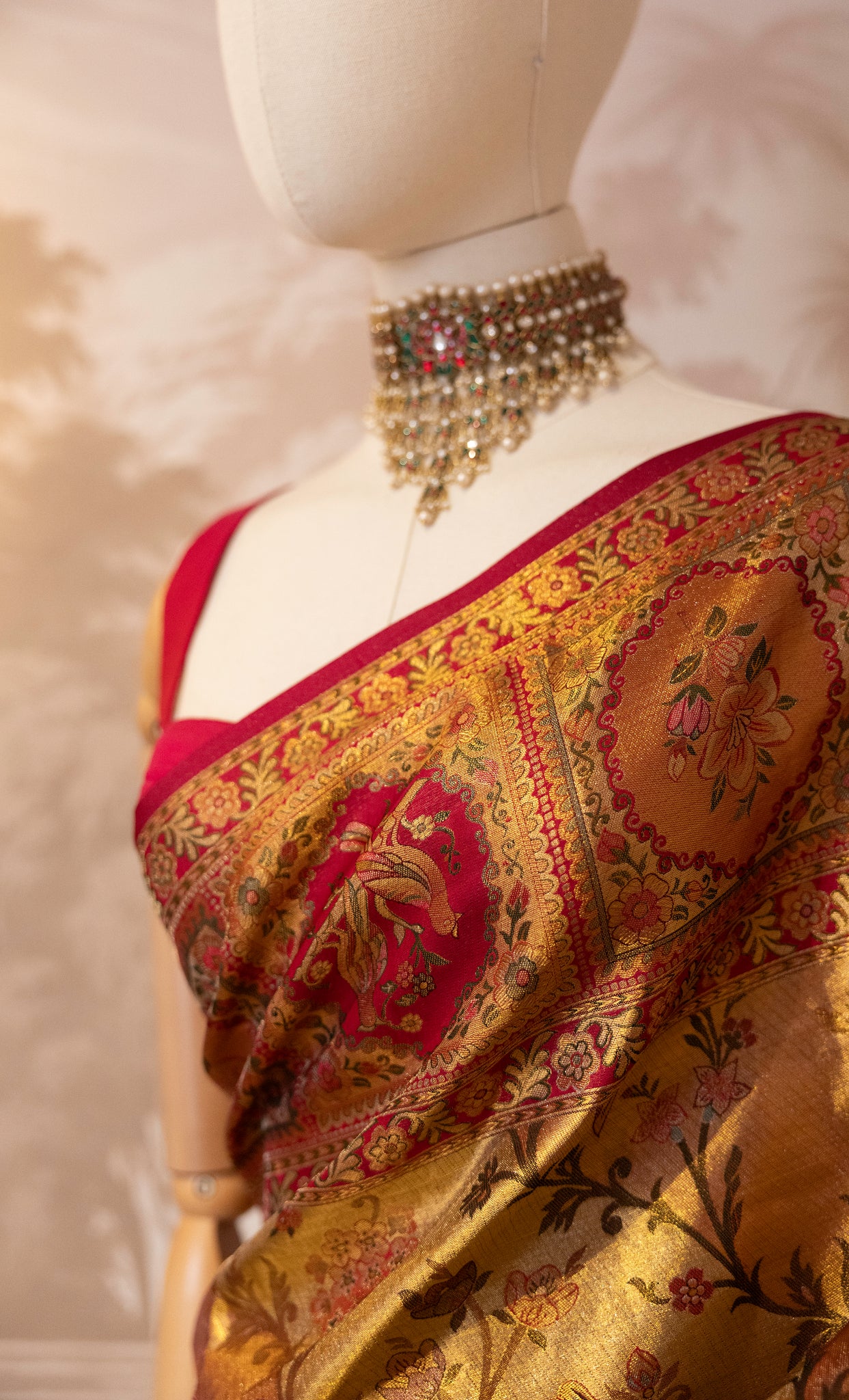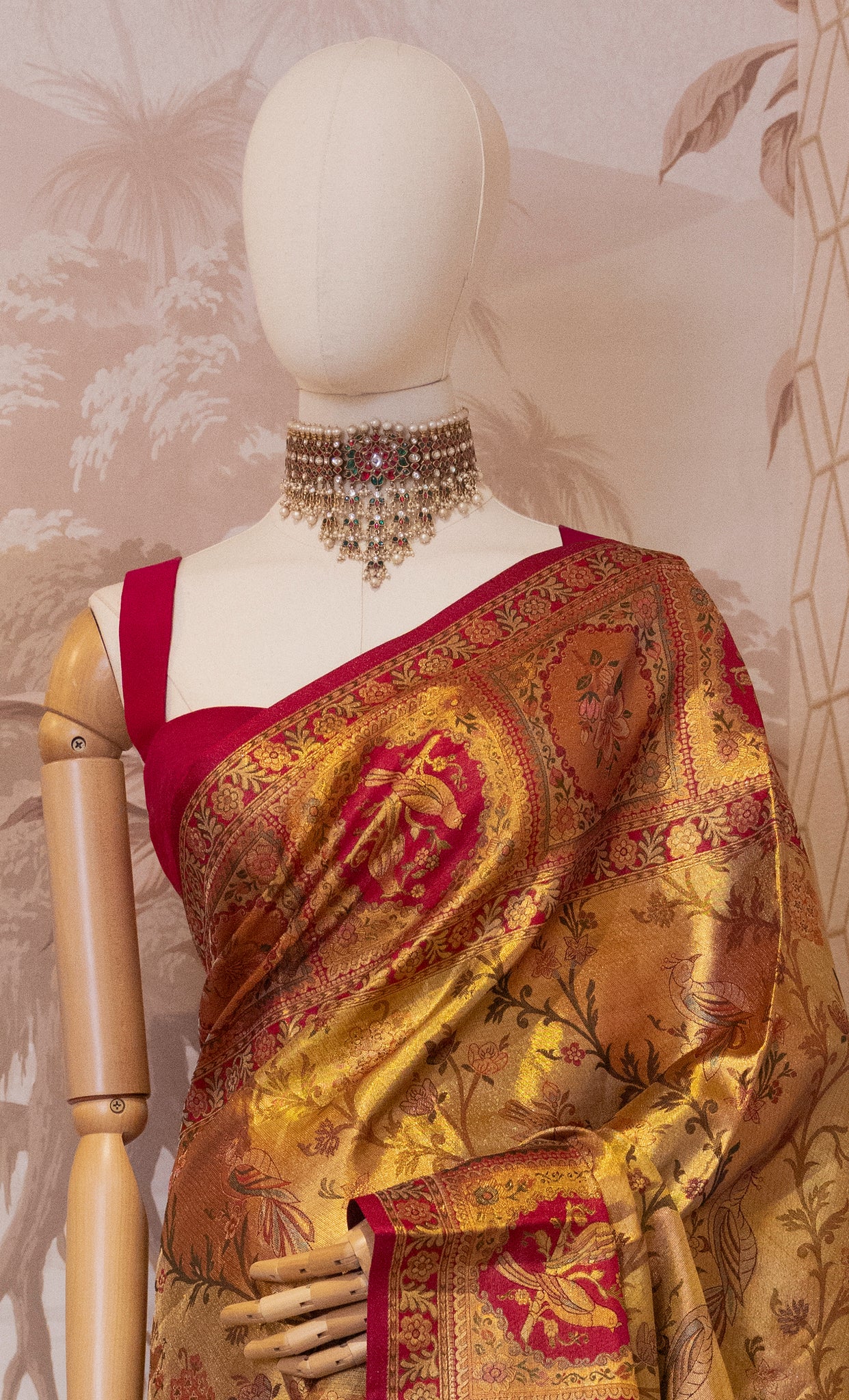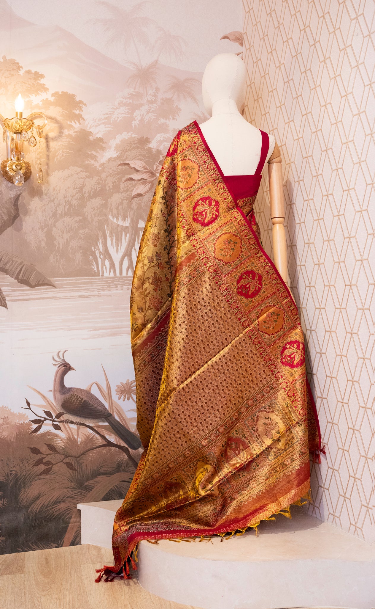 The contrasting ruby-red border frames the sari in opulent detail, where geometric checks meet timeless butas in a play of precision and poetry. Each drape catches the light with a molten glow, celebrating the heritage of South Indian silk in its most regal form.
