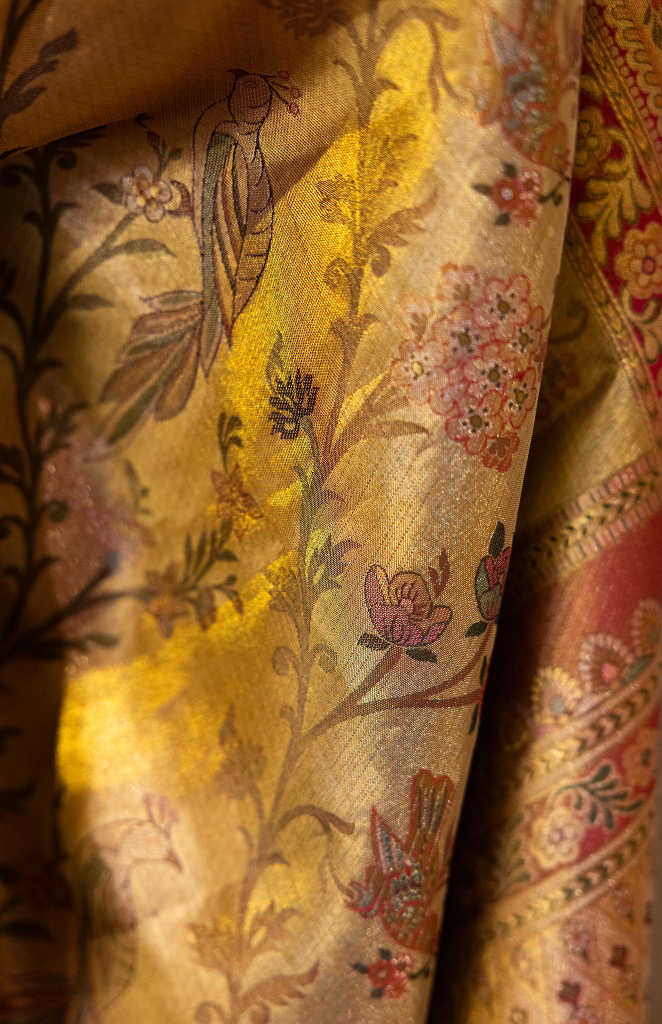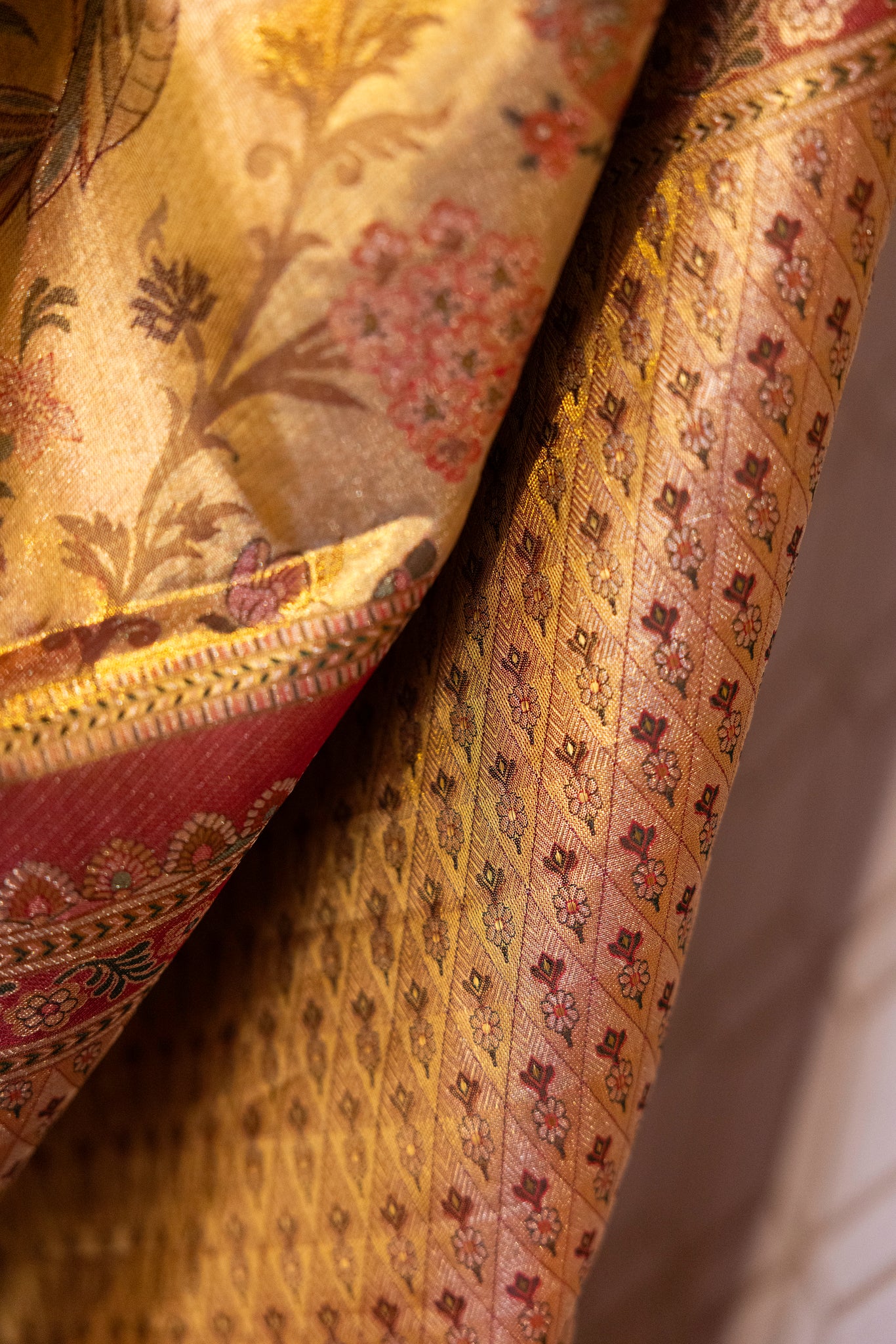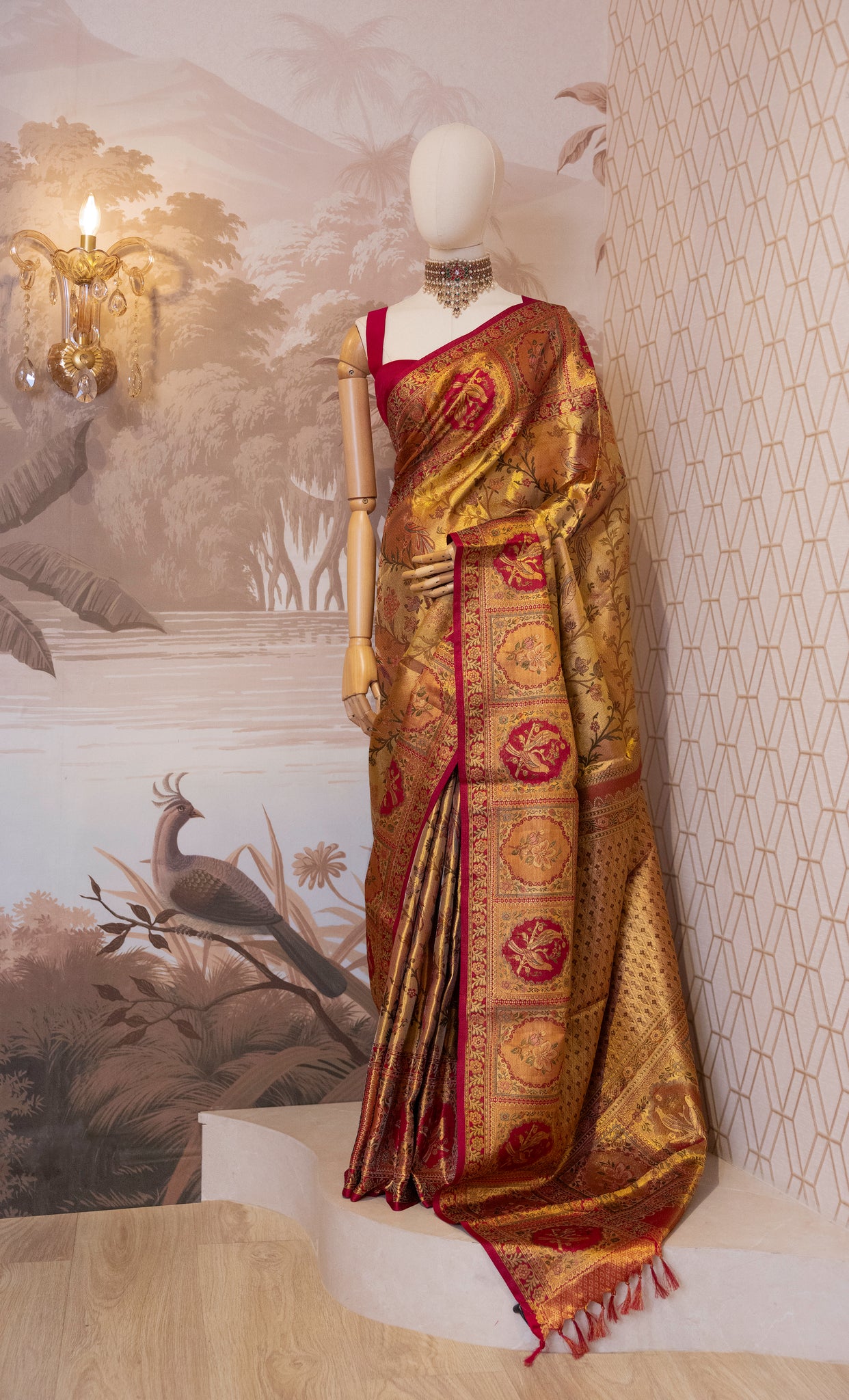A luminous weave of tradition and artistry, this resplendent gold Kanchipuram silk sari shimmers with the quiet grandeur of temple light. Handwoven by master artisans, its intricate zari motifs unfold like ancient frescoes — floral vines and medallions rendered in burnished gold and deep crimson threads.