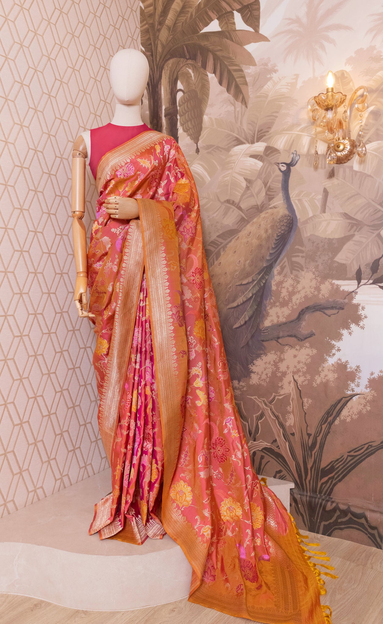 A profound statement in two toned coral and yellow. This Banarasi sari is not merely worn; it is experienced. Meticulously handwoven on pit looms in Varanasi, it revives the grandeur of a forgotten floral jacquard pattern with multi-colour Minakari, making it the ultimate investment for the woman who values heritage as much as she defines it. It radiates celebratory energy, while the golden patterns catch the light with every movement, making it perfect for weddings, festive occasions, and heirloom collections.